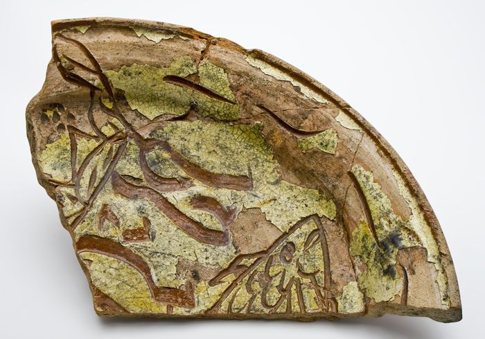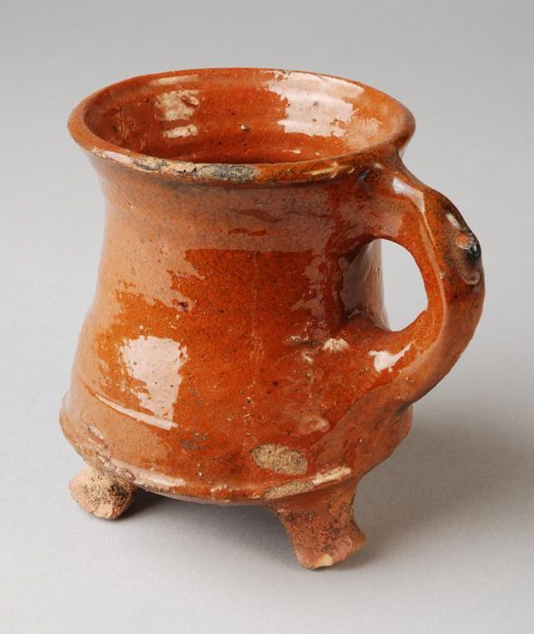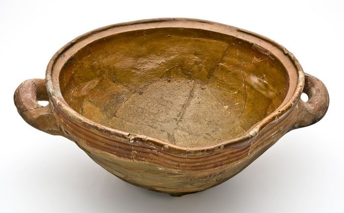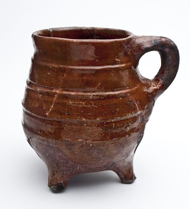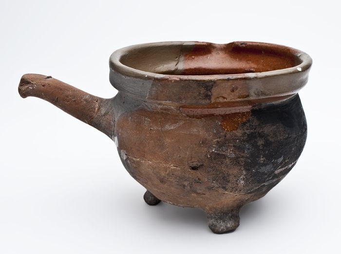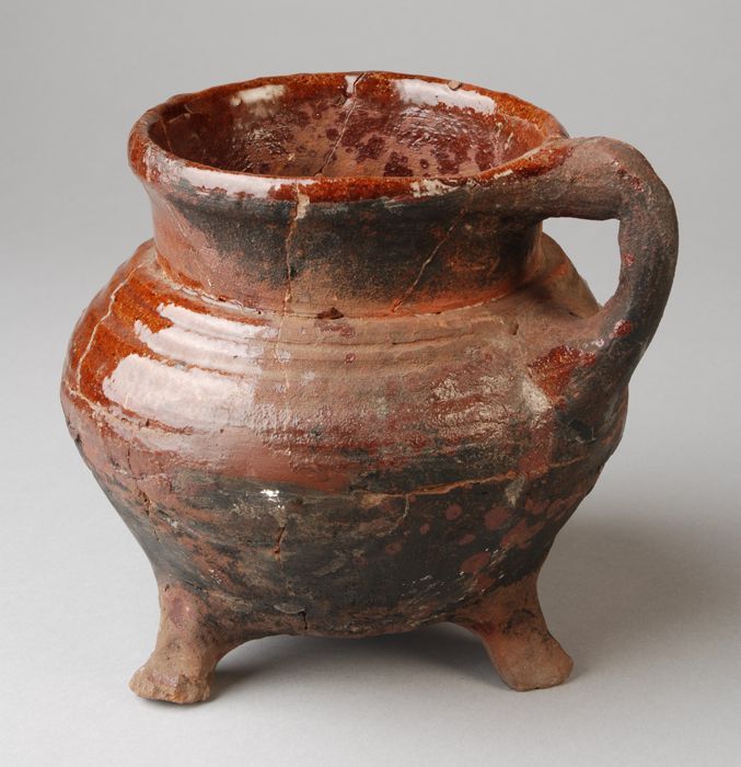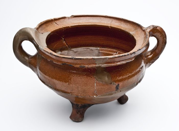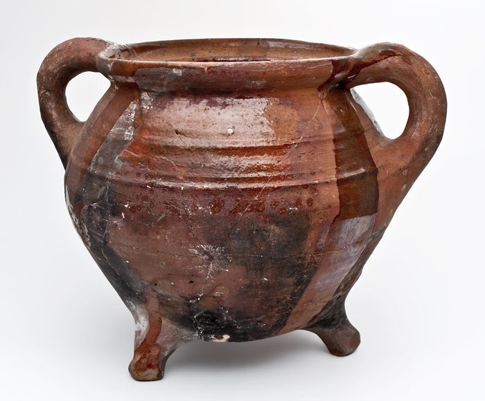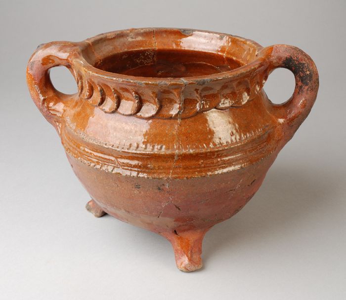 Aardewerk grape op drie poten, spaarzaam loodglazuur...