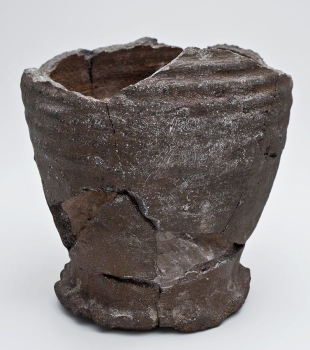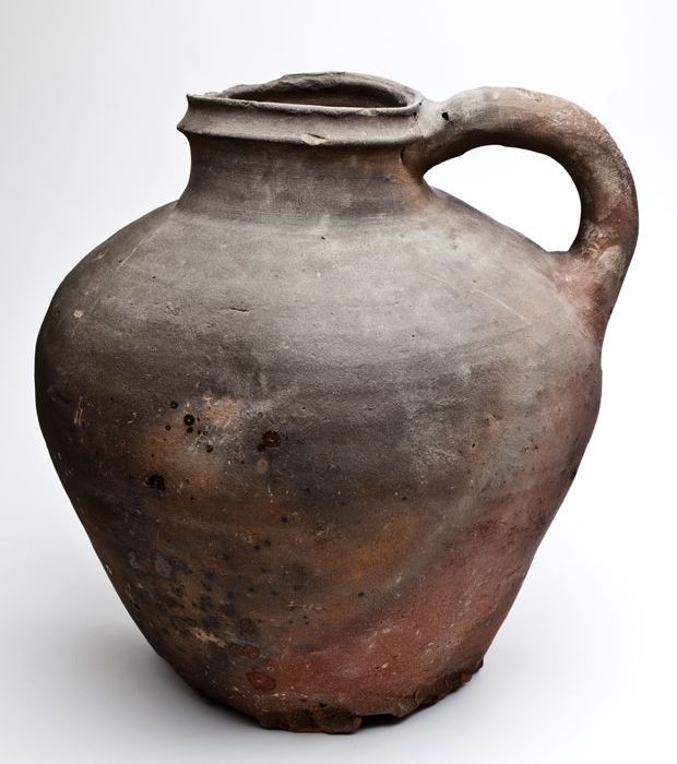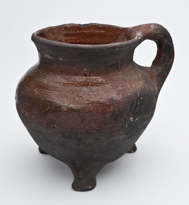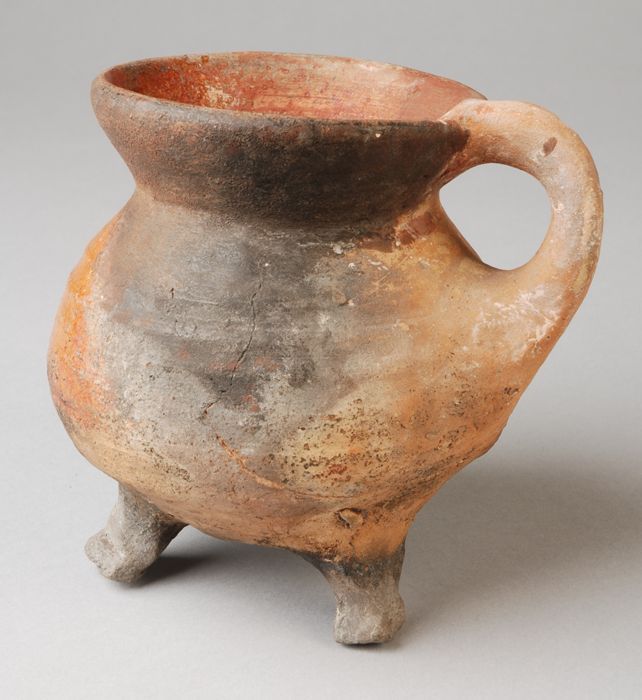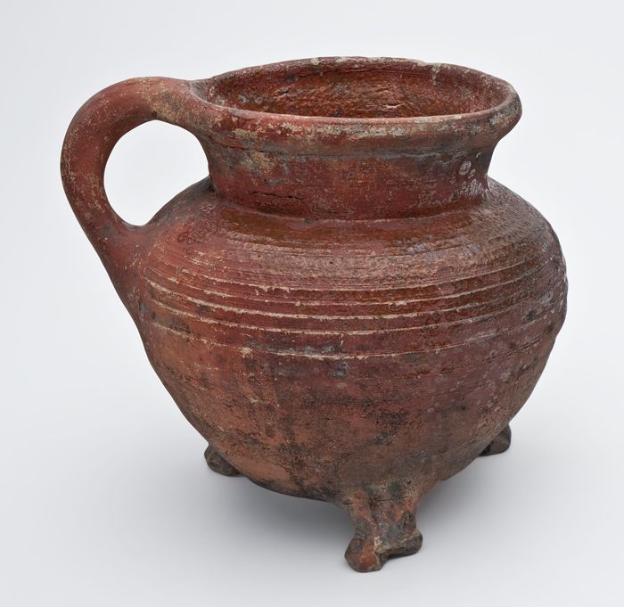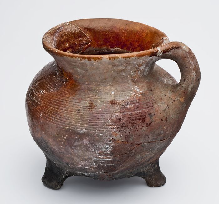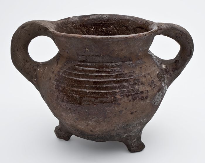 Aardewerk grape op drie poten, draairingen op de sch...