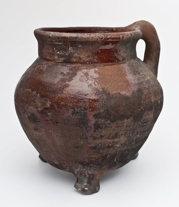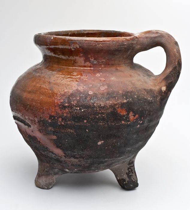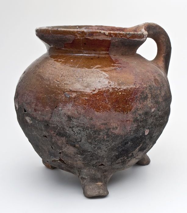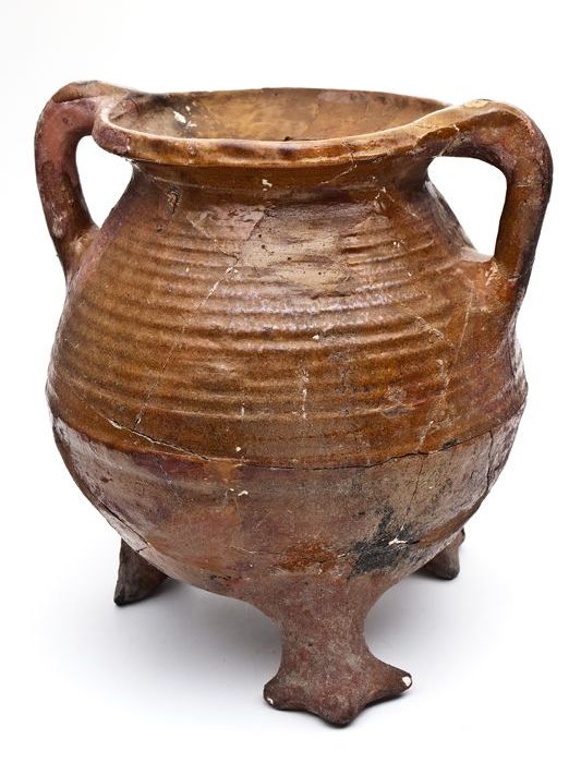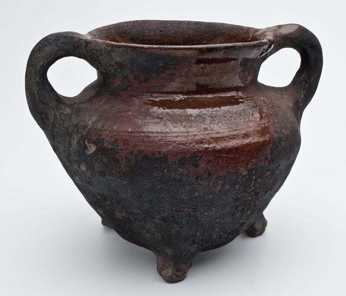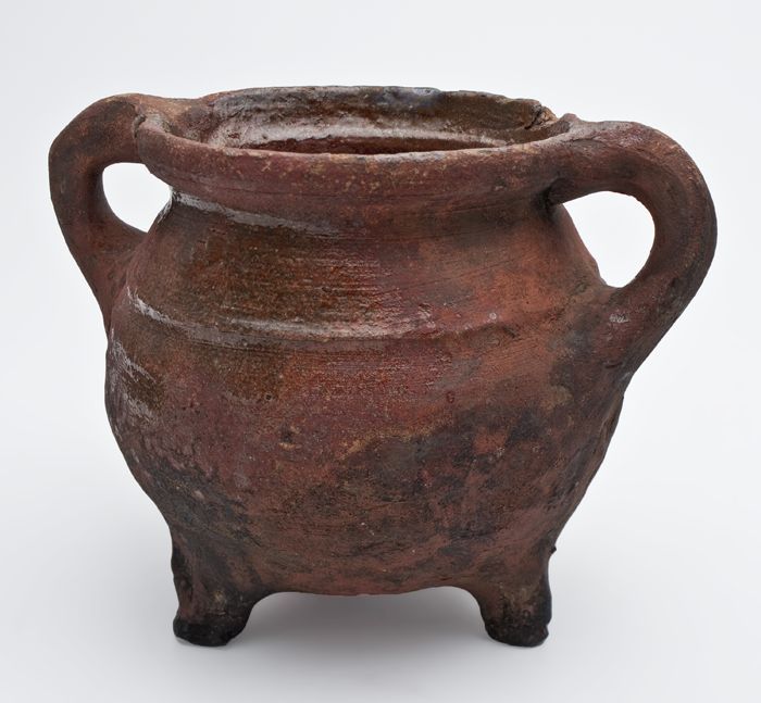 Aardewerk kookpot of voorraadpot op standvinnen met ...