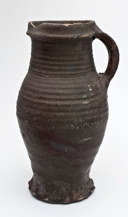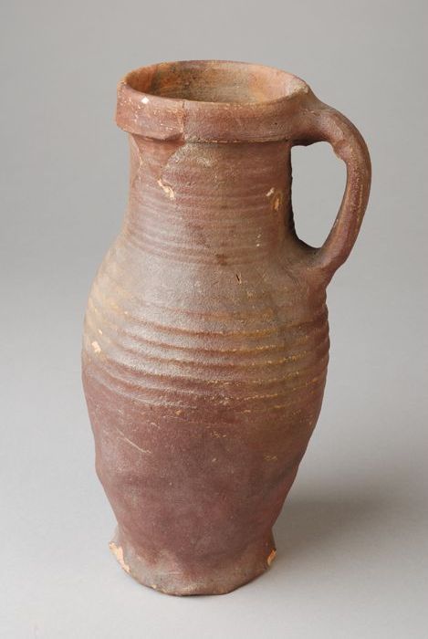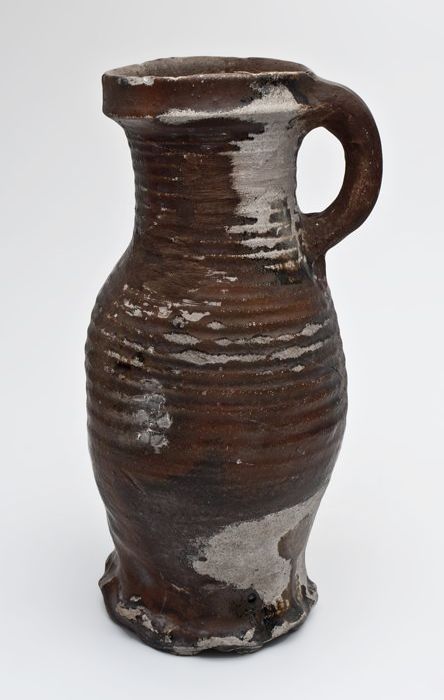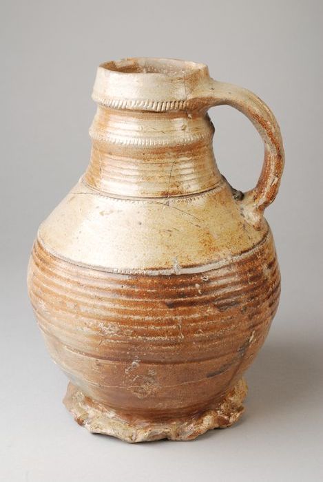 Grote steengoed kan, licht bruin glazuur, radstempeling
