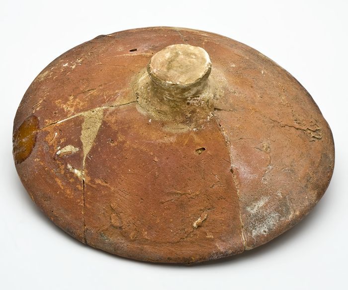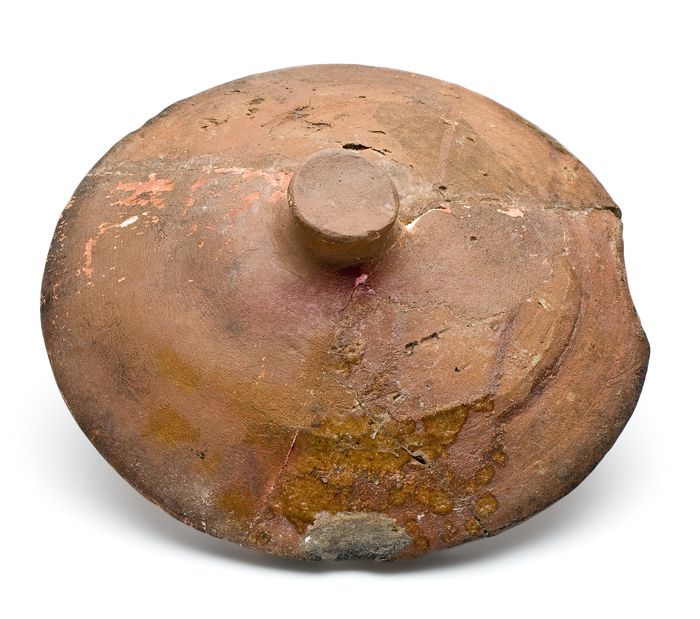 Aardewerk deksel met knop als handgreep, rode scherf...