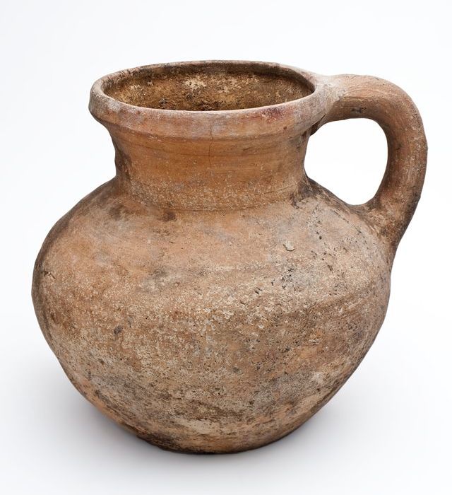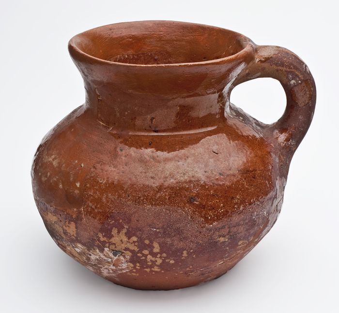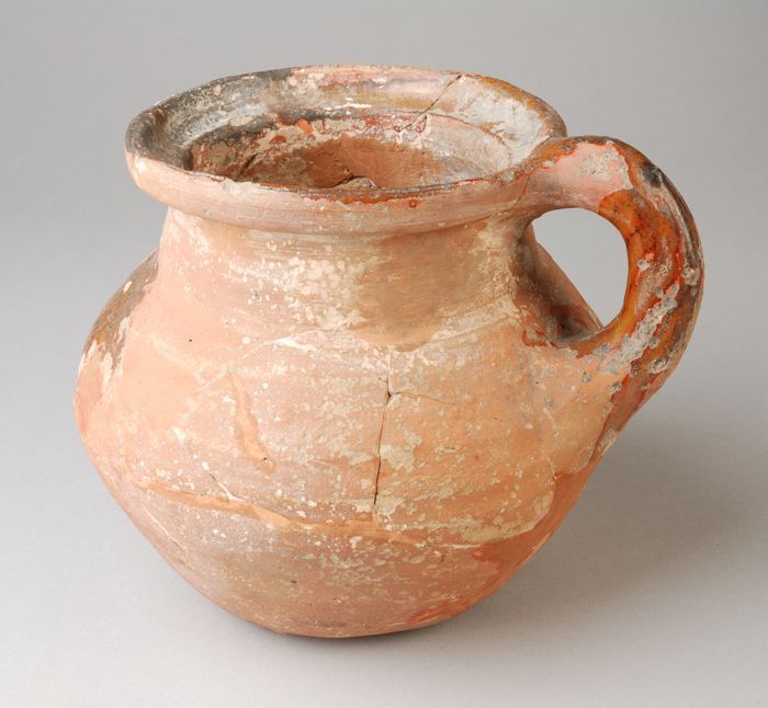 Aardewerk kamerpot met gewelfde bodem, ongeglazuurd ...