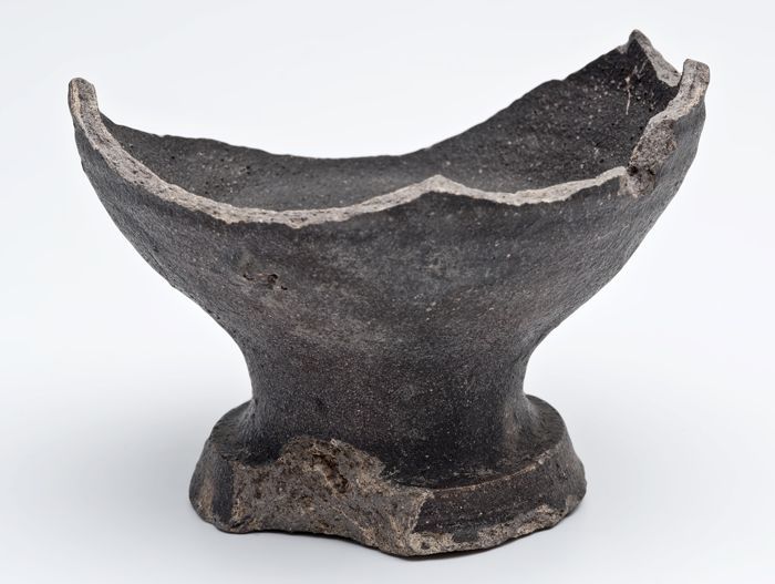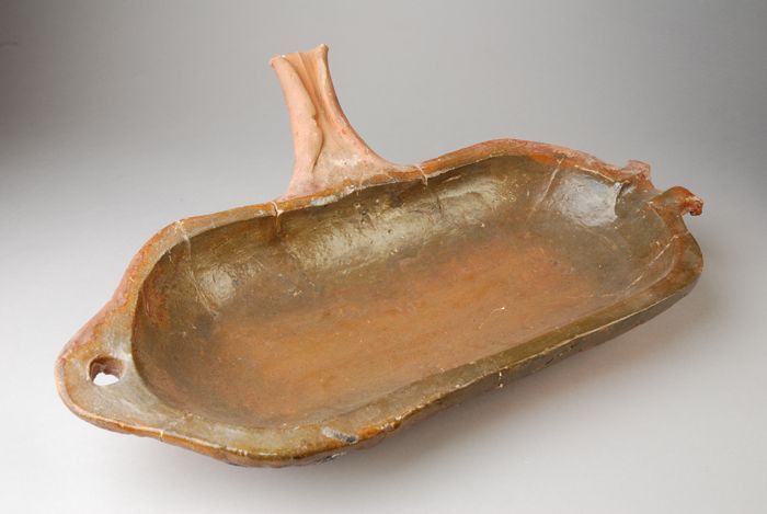 Aardewerk bak met gebolde bodem en kleine ziel, vier...