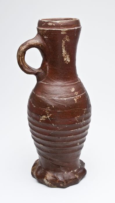 Steengoed kan op geknepen voet, bruine engobe, deuke...