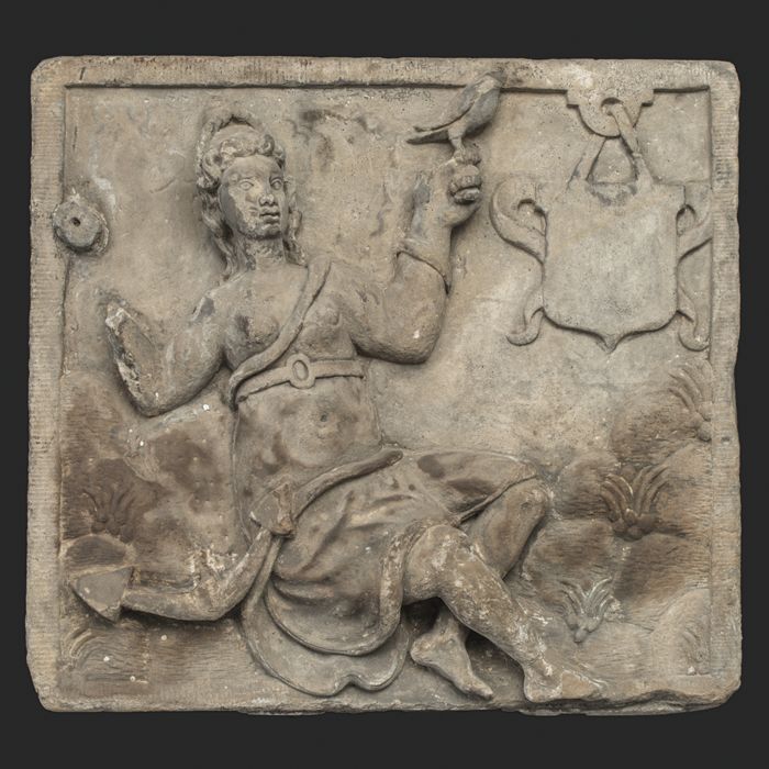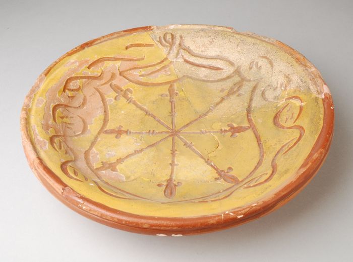Aardewerk schotel op hoge voet, wapenschild in slibt...