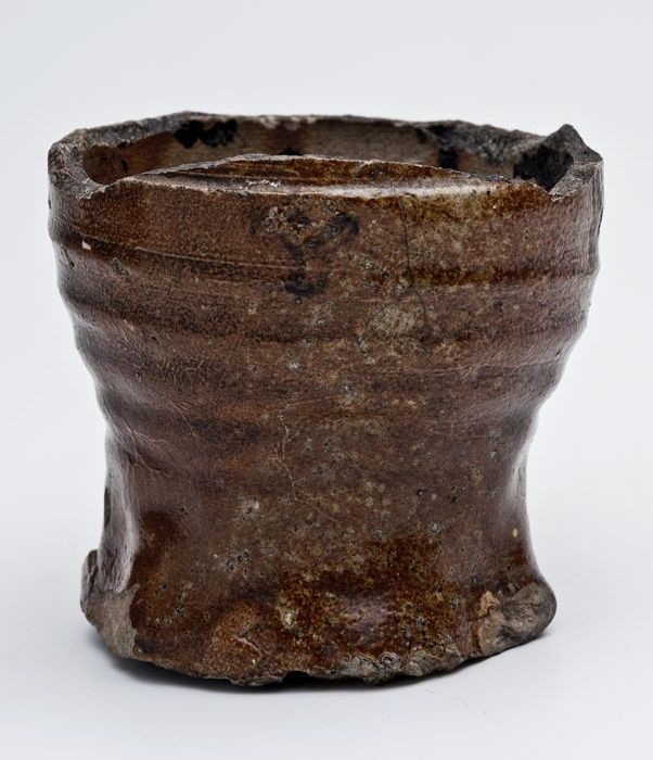 Bodem van steengoed drinkkan of beker op geknepen vo...