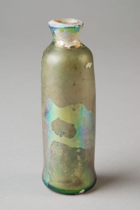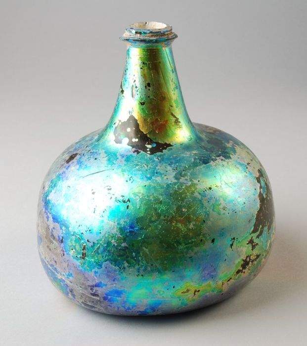 Buikfles, sterk geïriseerd, conische hals, glasdraad...