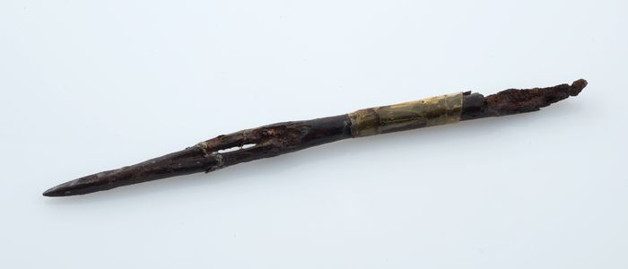 Naald met oog en heft, punt met iets daarachter een ...