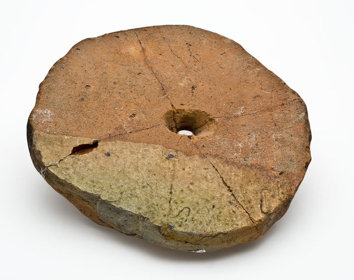 Deel dakpan, rode scherf, bewerkt, rond gemaakt en d...