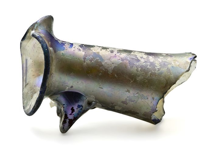 Vier fragmenten van glazen karaf, twee halsfragmenten