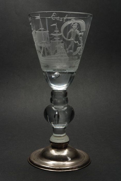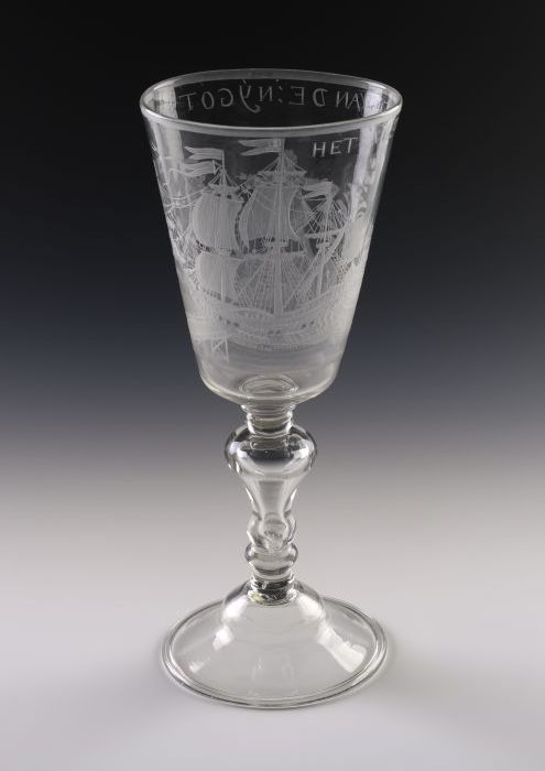 Kelkglas gegraveerd met driemaster, Fortuna, "Prospe...