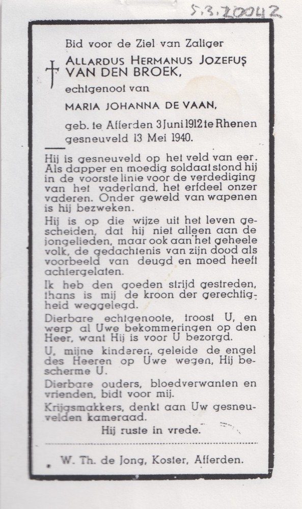 Bidprentje van Allardus Hermanus Jozefus van den Broek