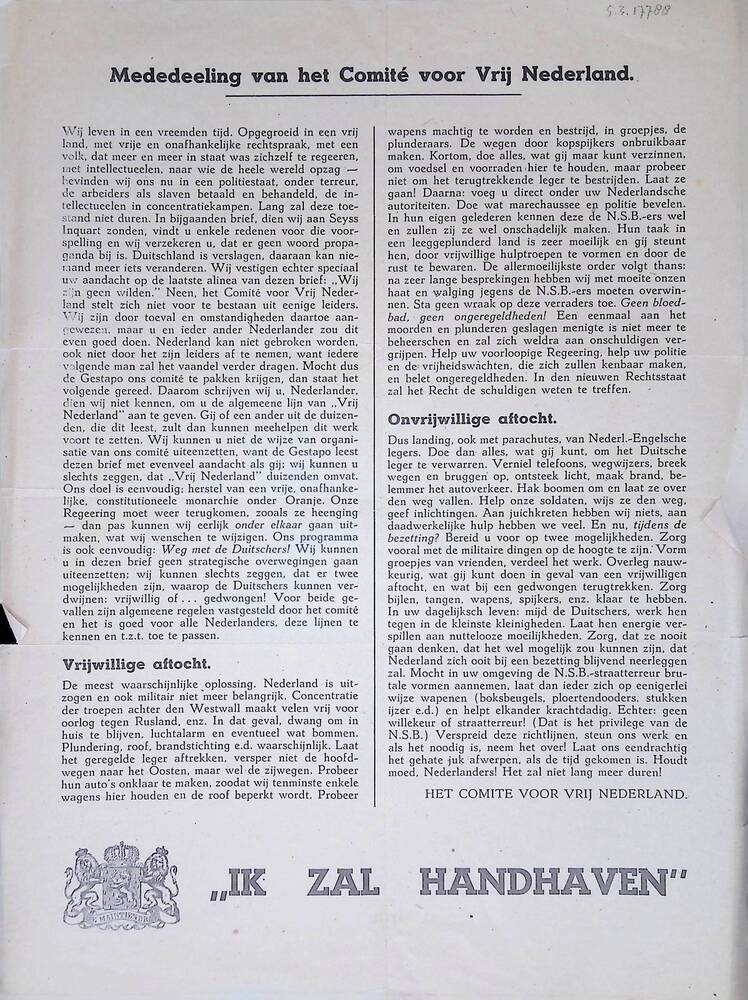 Mededeeling van het Comité voor Vrij Nederland, onge...