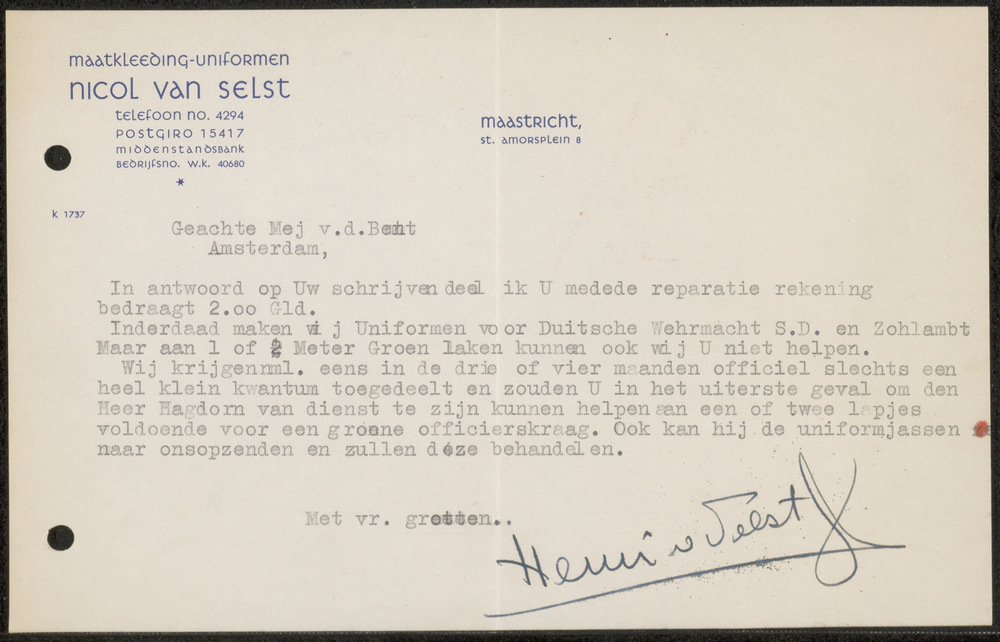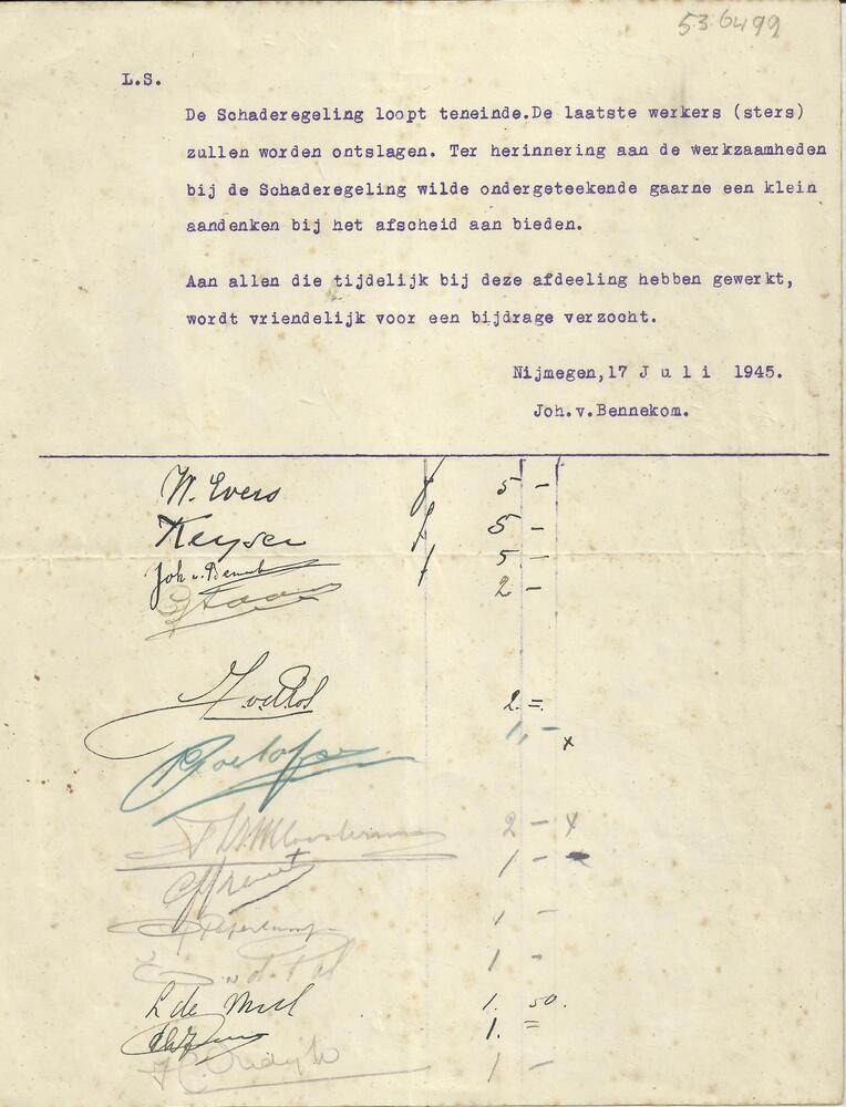 Brief: Intekenlijst geschenk bij einde schaderegelin...