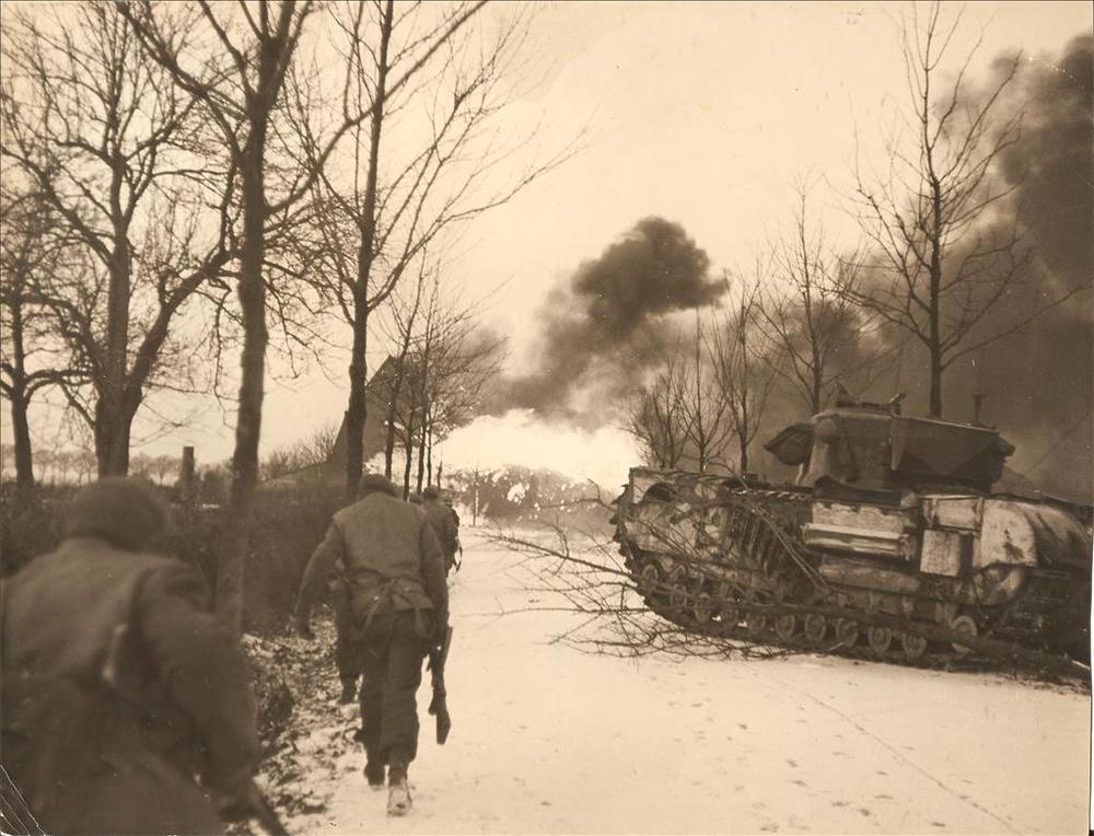 Britse Churchill vlammenwerper tank en Britse infant...
