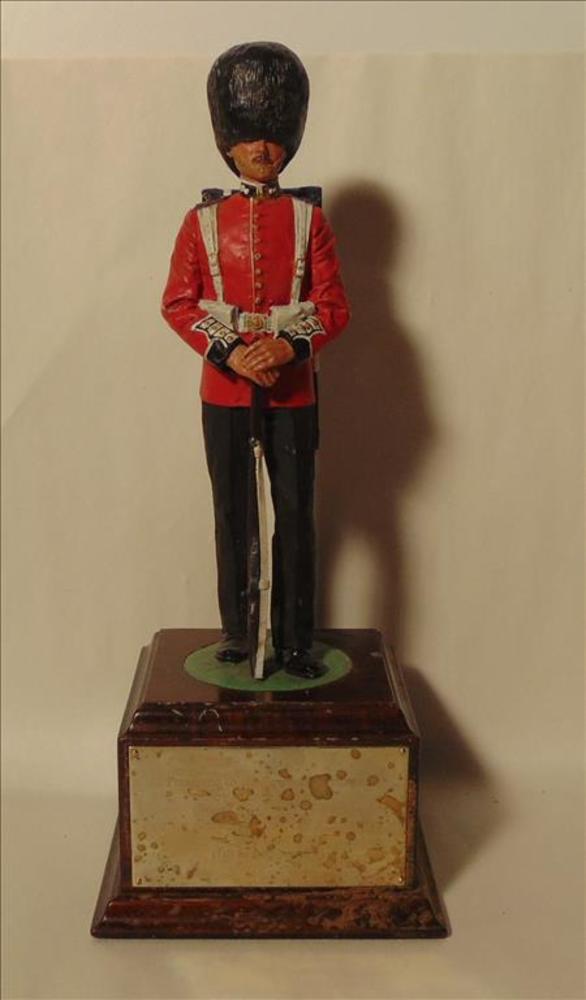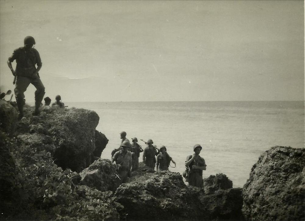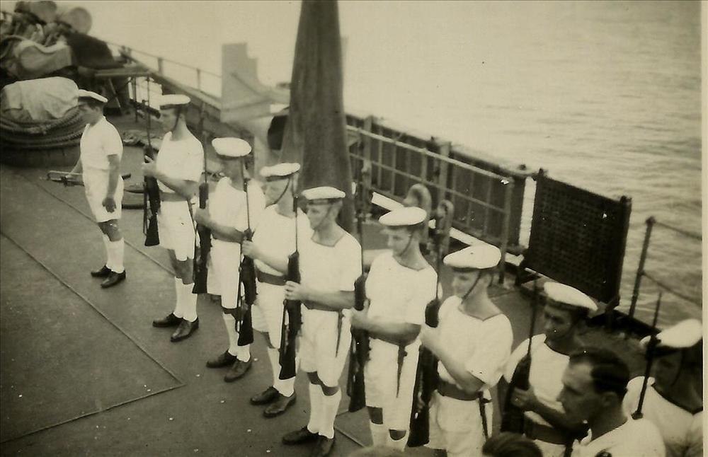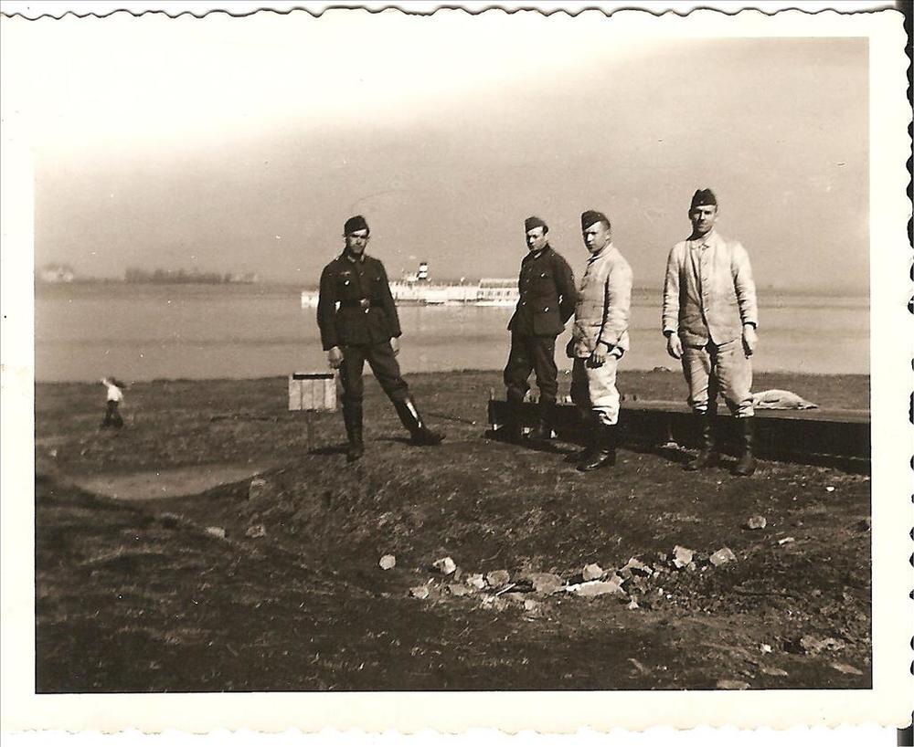 Foto van vijf Nederlandse millitairen op een kade vo...