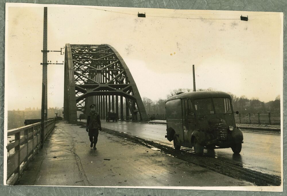 Y.M.C.A. bus op de Waalbrug, Nijmegen, januari 1945.