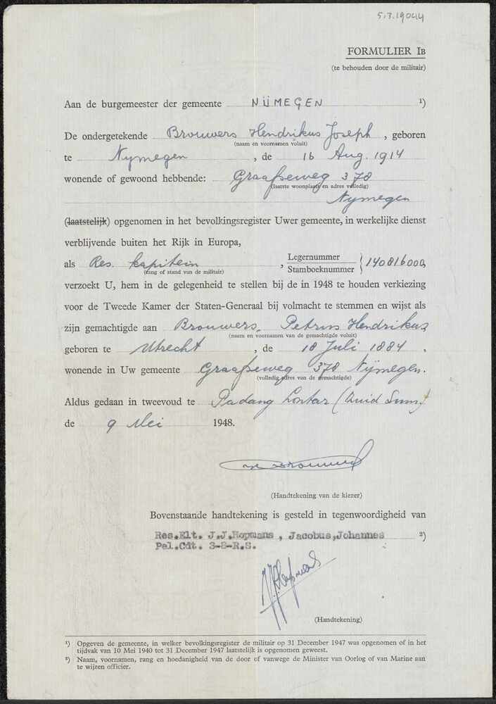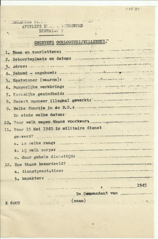 Formulier gegevens oorlogsvrijwilligers, 1945