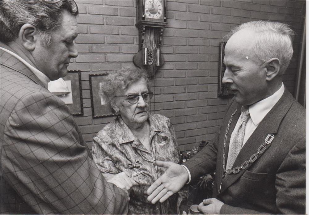 Foto van Theodora Bosch temidden van gasten bij gele...