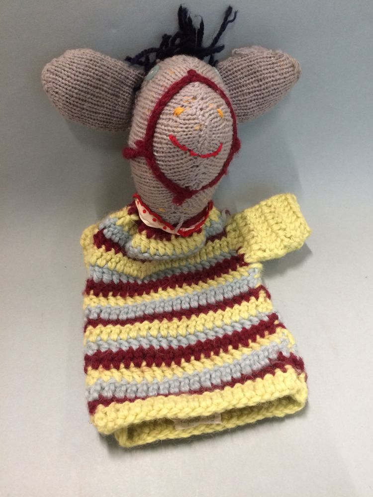 Handpop van ezel met gebreide grijze kop en gehaakt ...