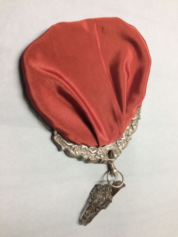 Zilveren tasbeugel aan haak met paars fluwelen tas