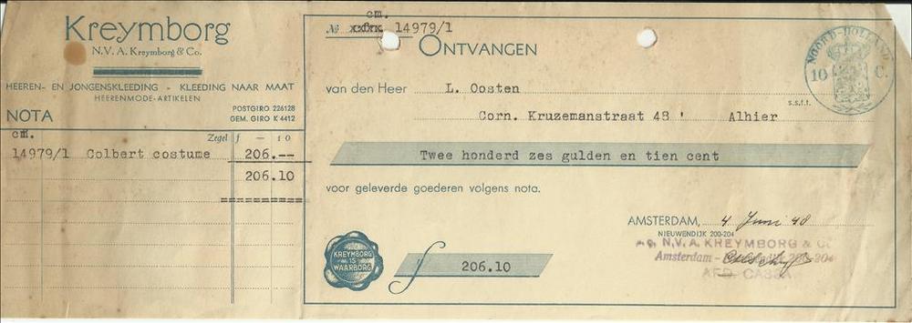 Rekening voor dhr van Oosten van Kreymborg kleeding ...
