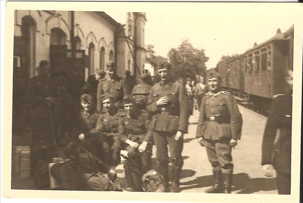 Duitse militairen op perron bij gebouw en personentrein