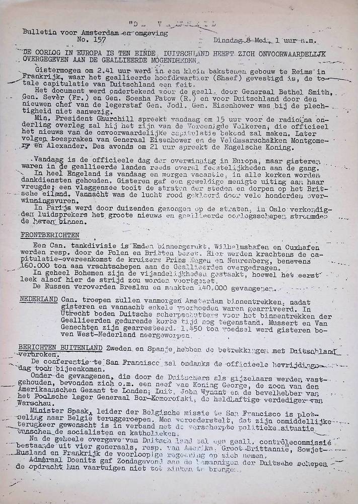 De Vryheid, 8 mei 1945, bulletin voor Amsterdam en o...