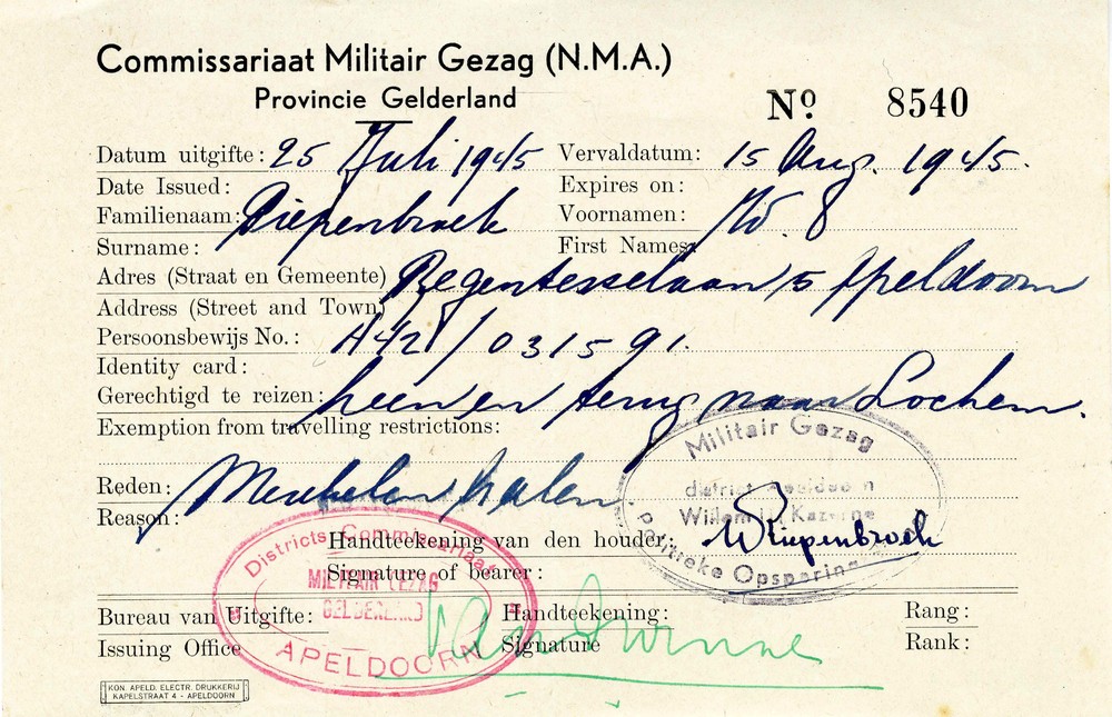 doortochtbewijs op naam vam W.J. Piepenbroek, 2 en 2...