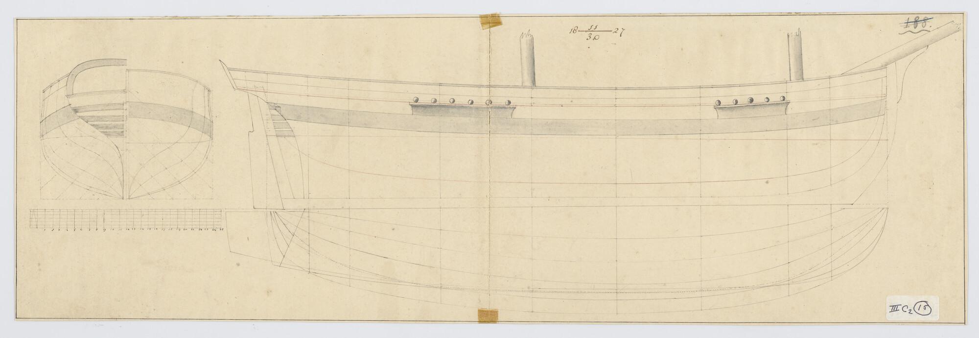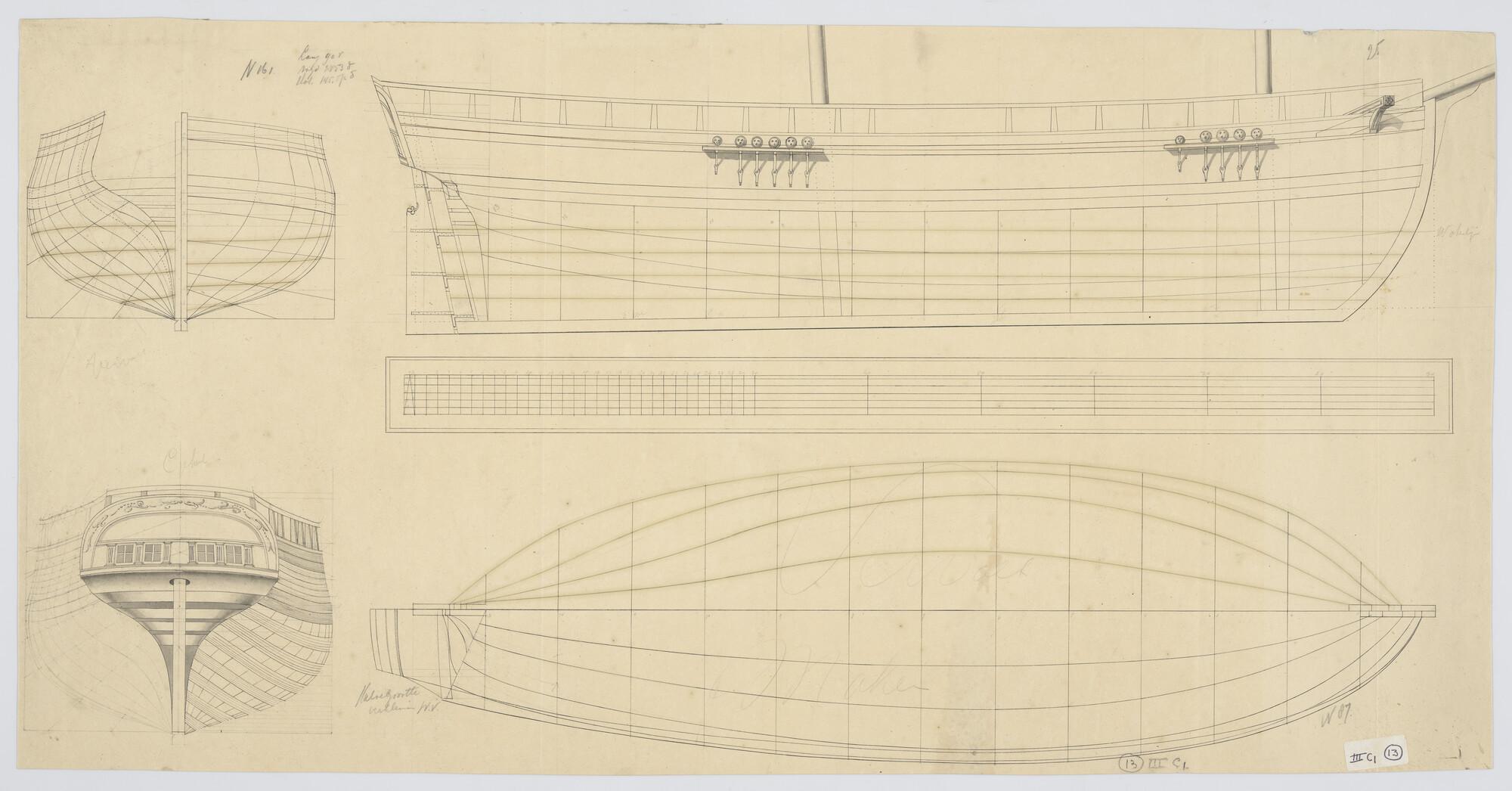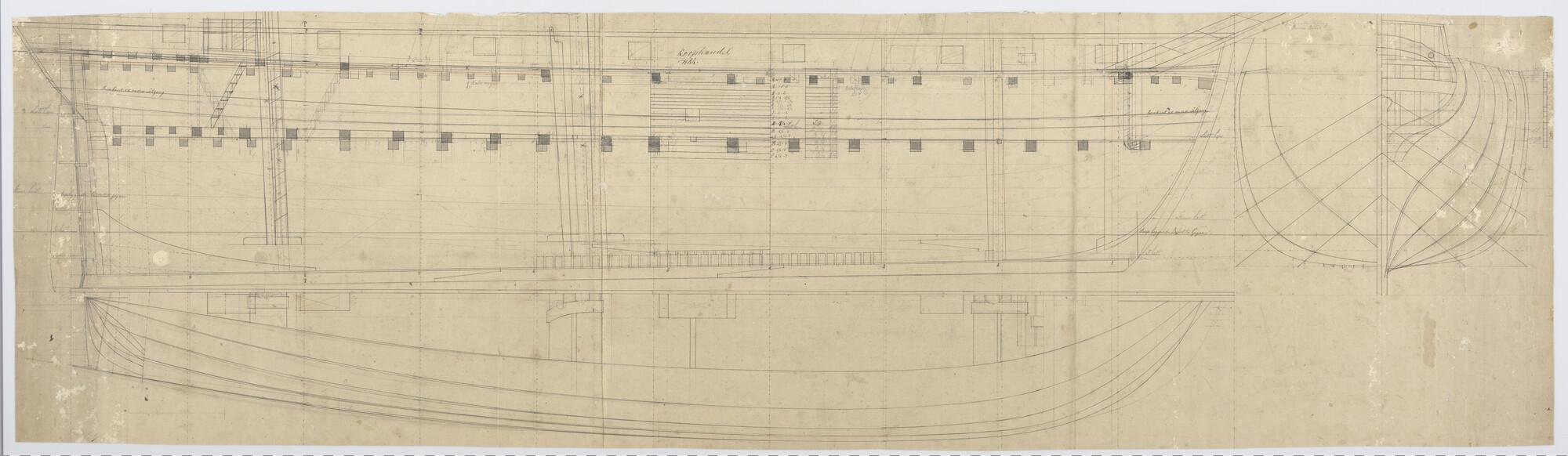 Lijnenplan voor-en achterschip van het barkschip 'Ko...