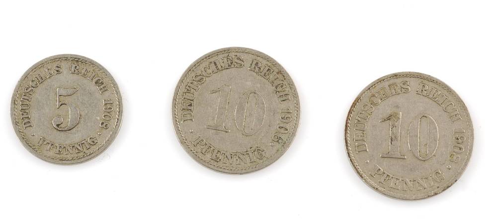drie munten: pfennig 1906, 1908
