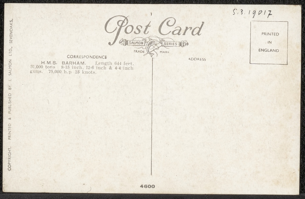 Briefkaart met tekening van H.M.S. Barham