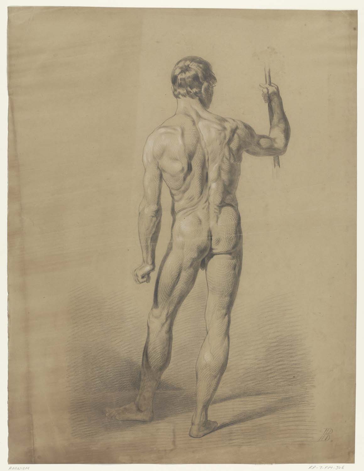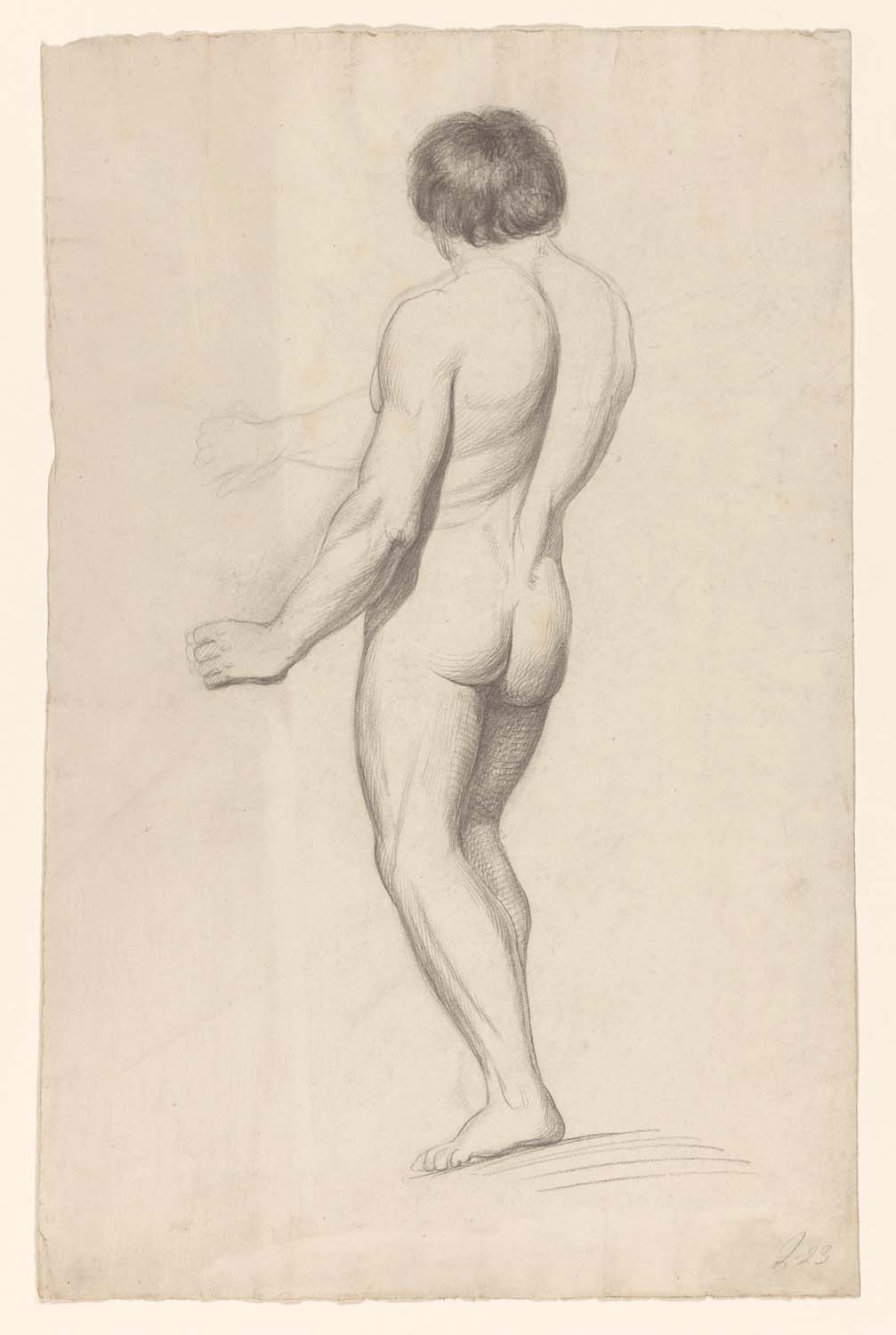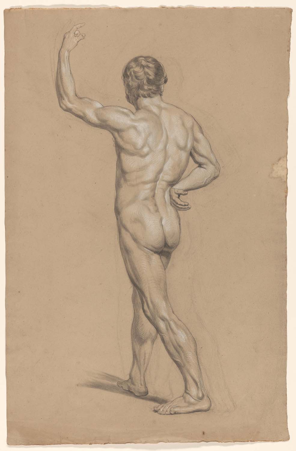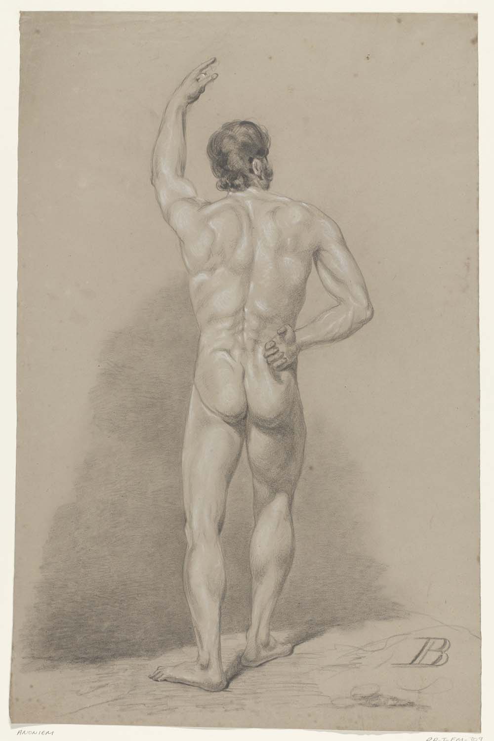 Staand mannelijk naakt met opgeheven arm, van achter...