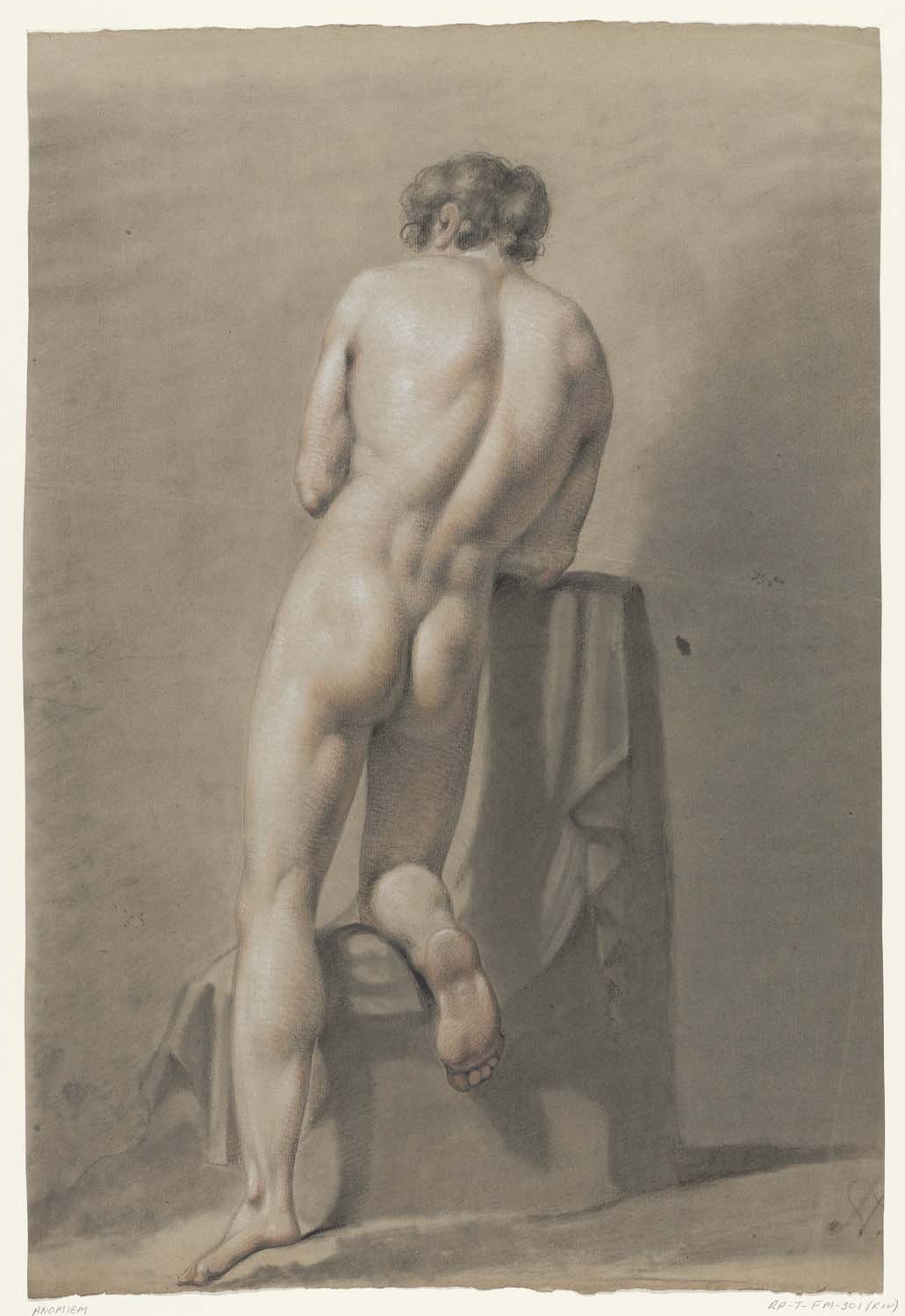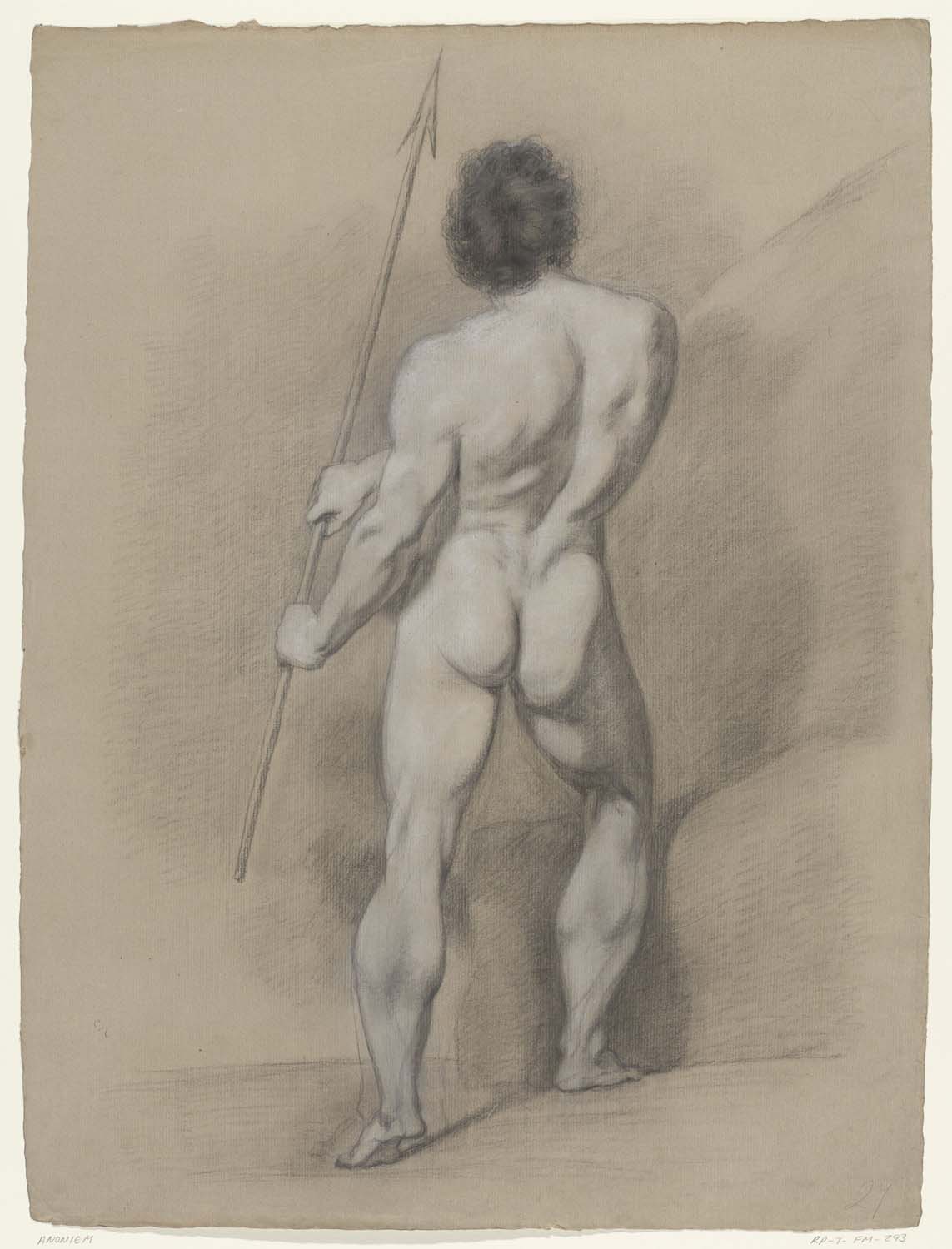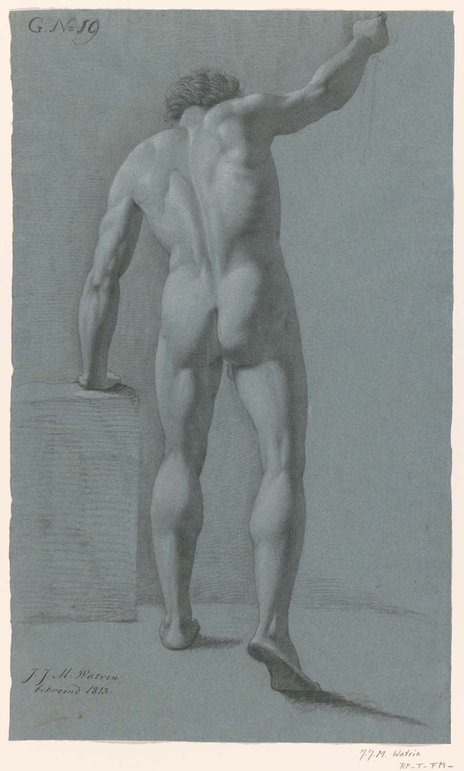 Staand mannelijk naakt met opgeheven arm, van achter...