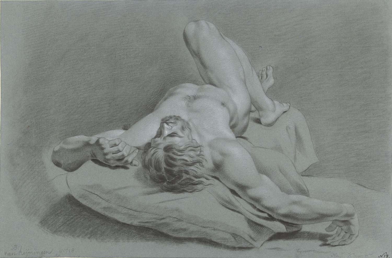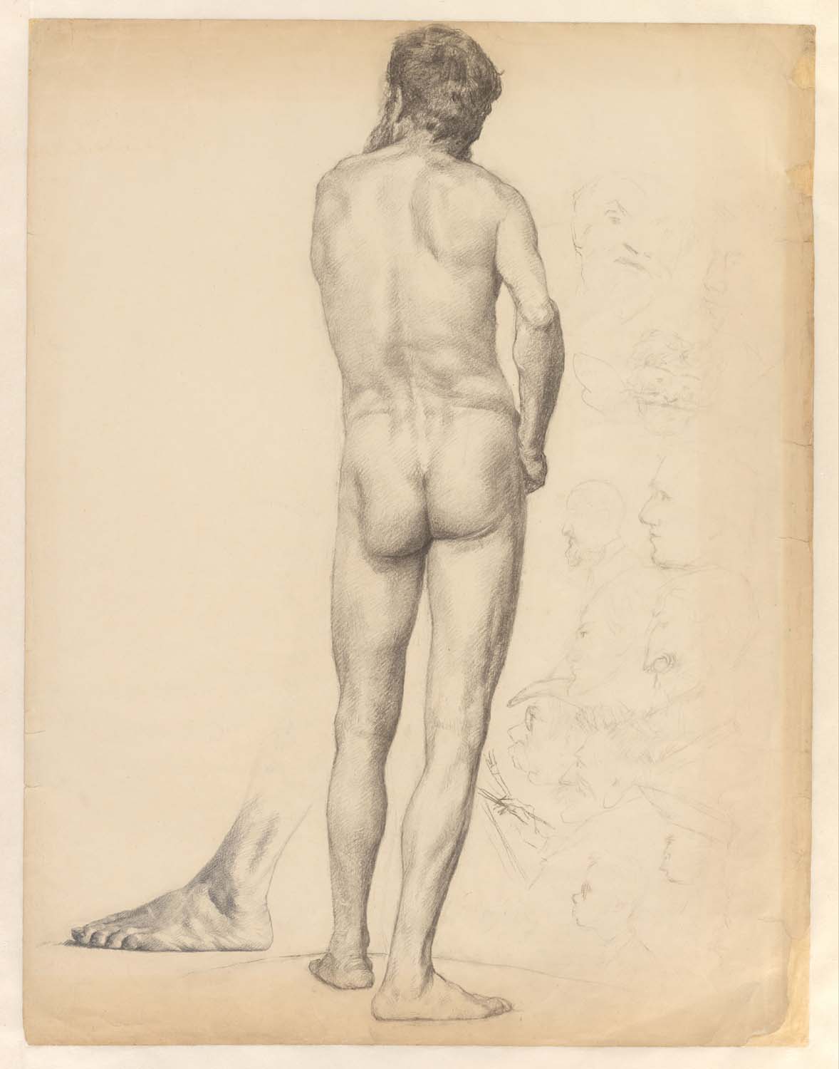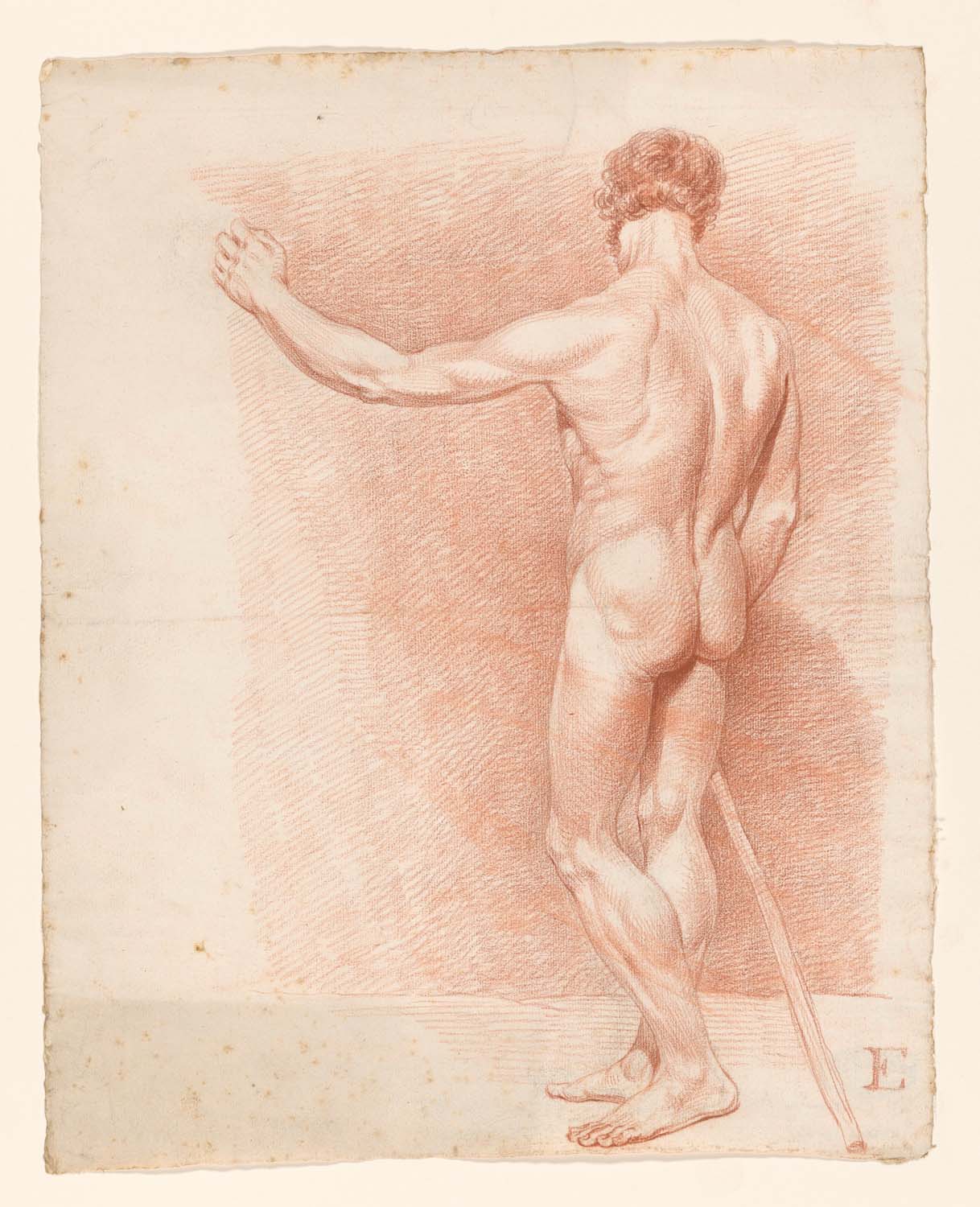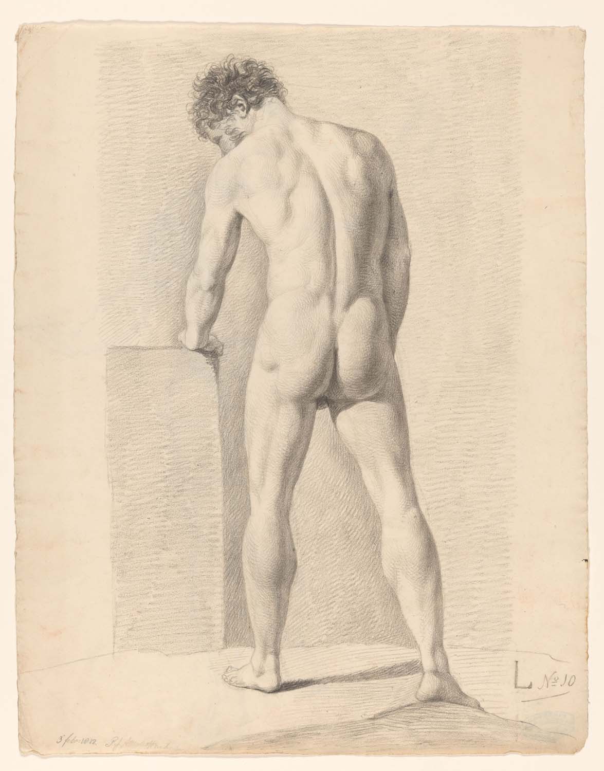 Staand mannelijk naakt met opgeheven arm, van achter...