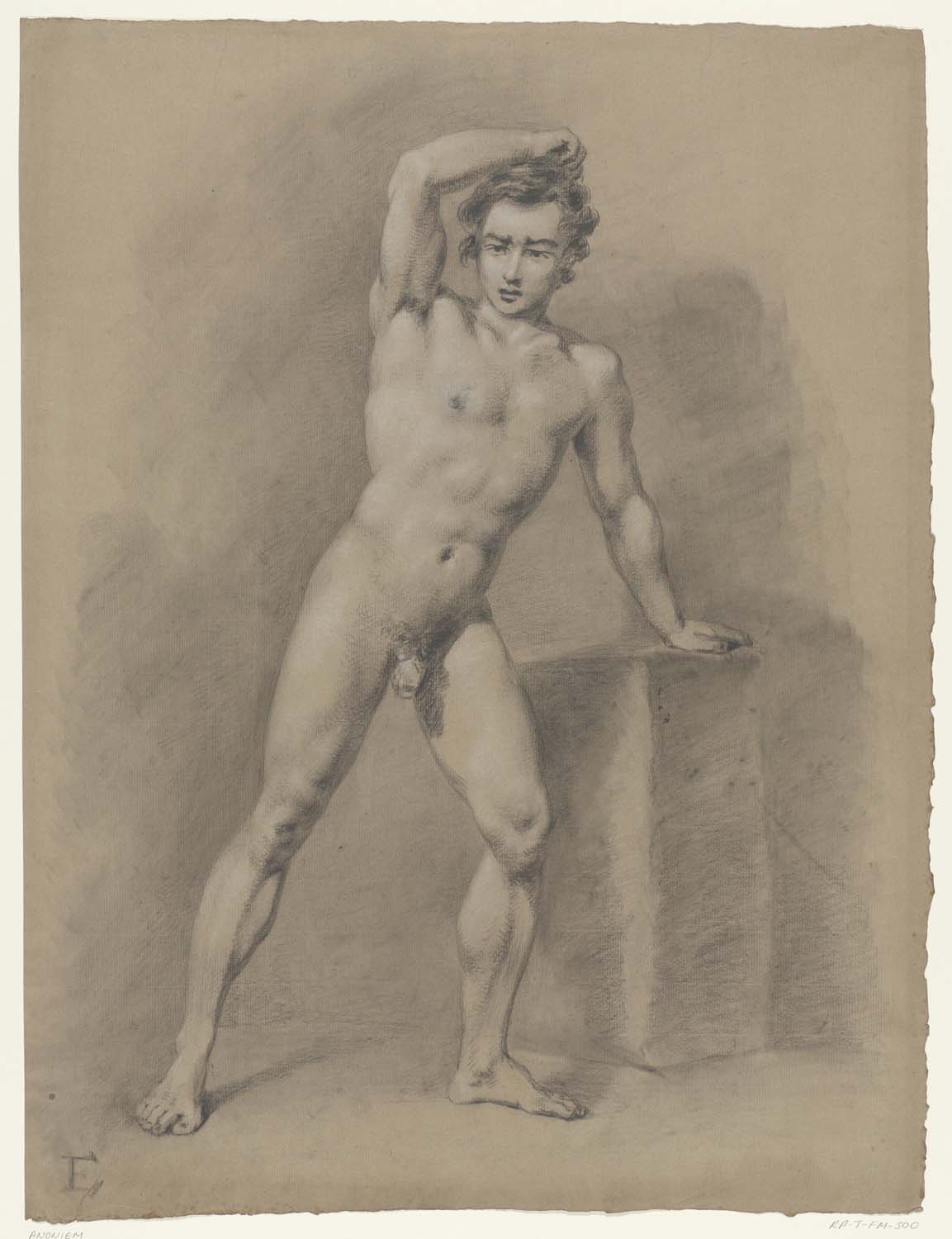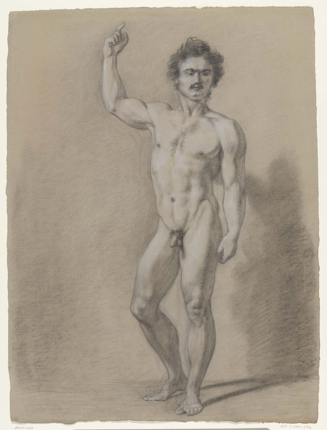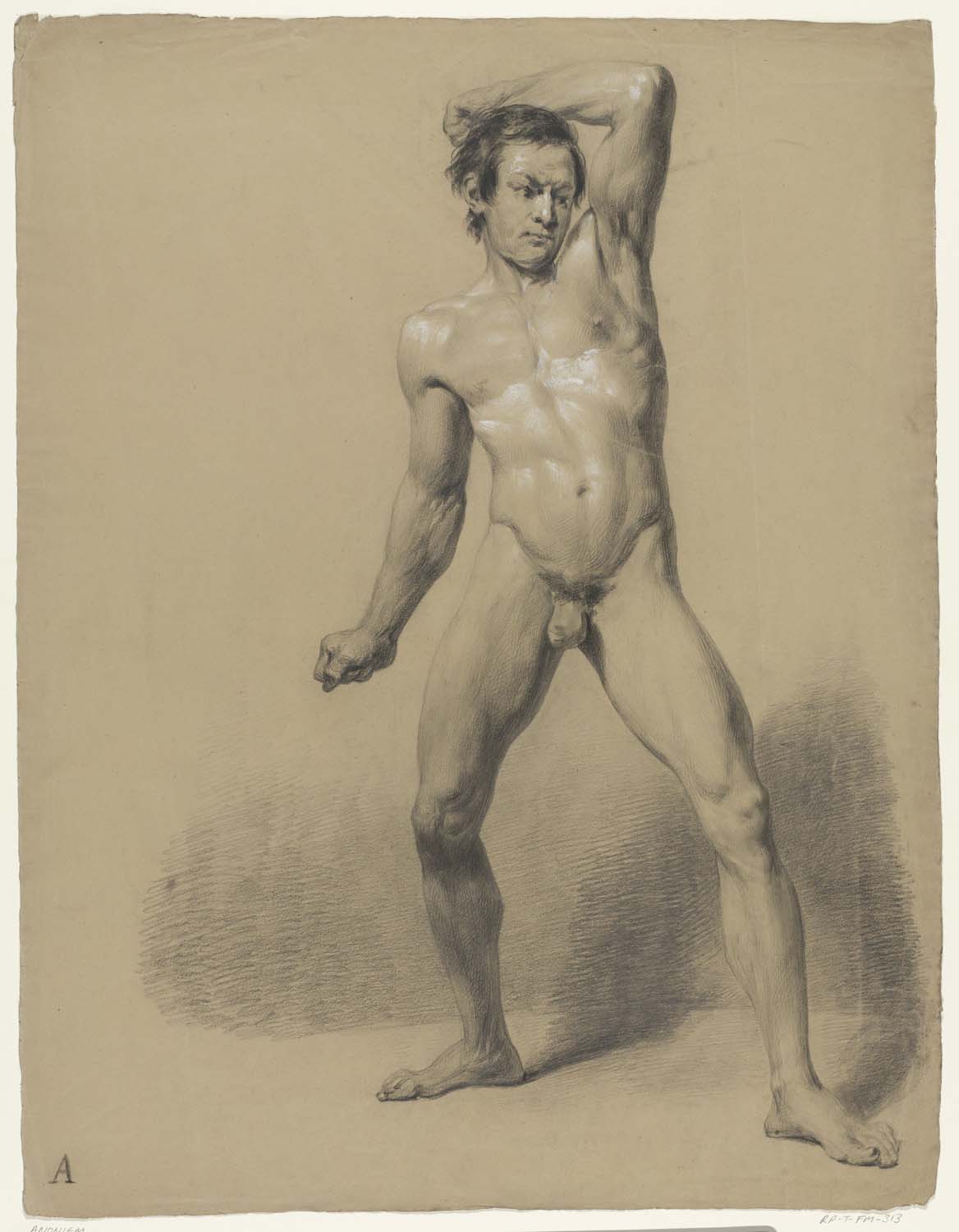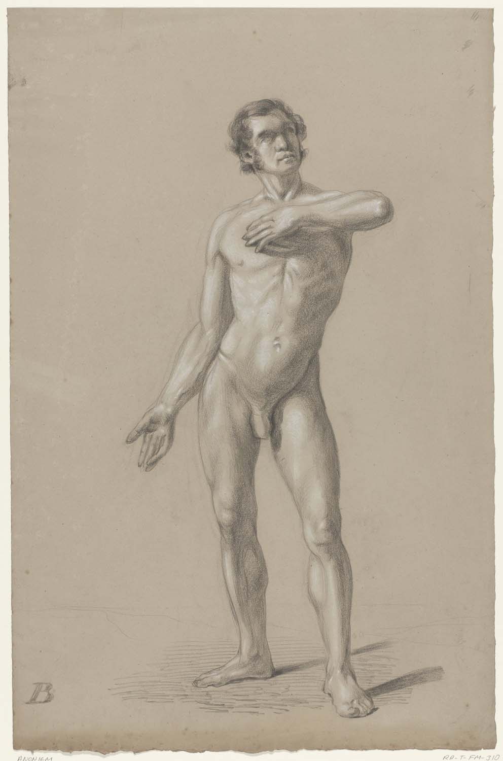Staand mannelijk naakt met opgeheven arm, naar rechts