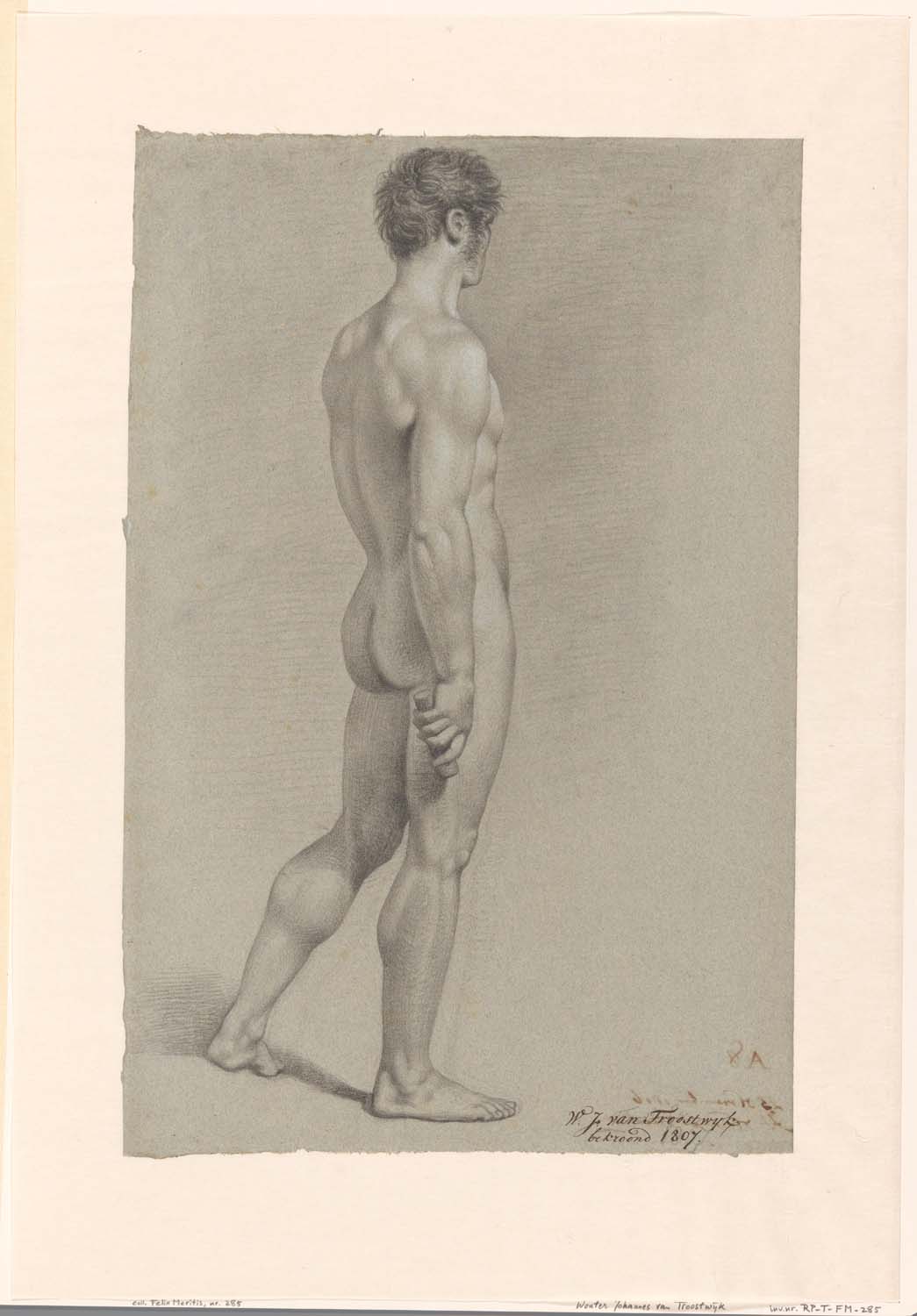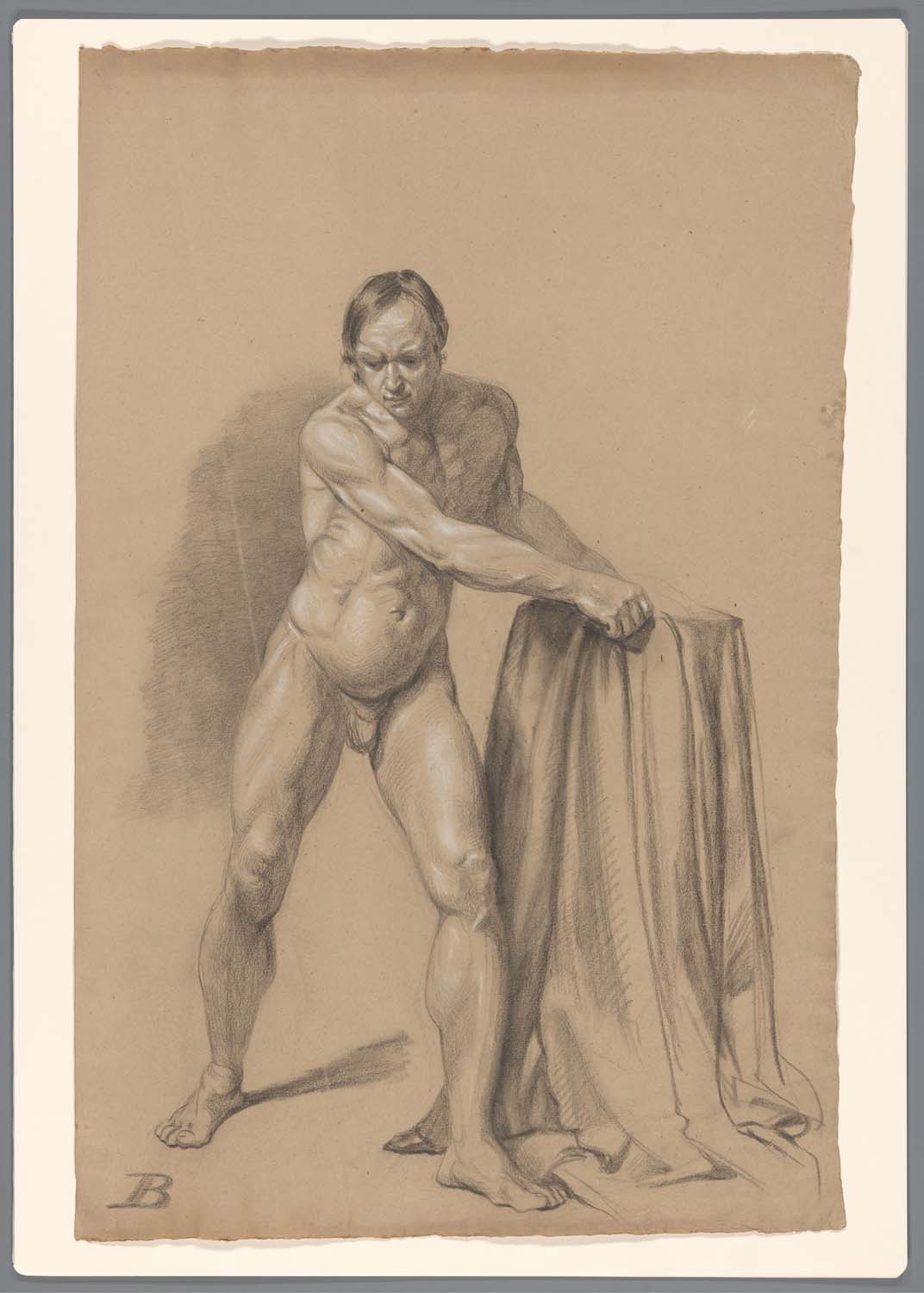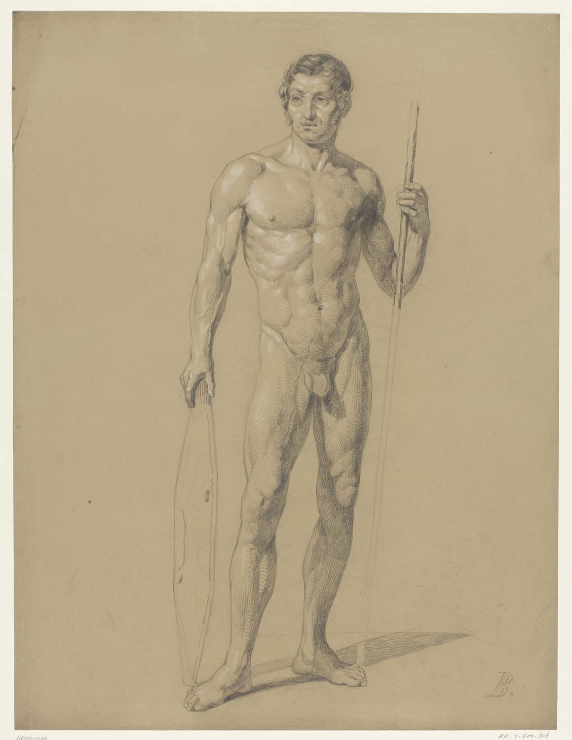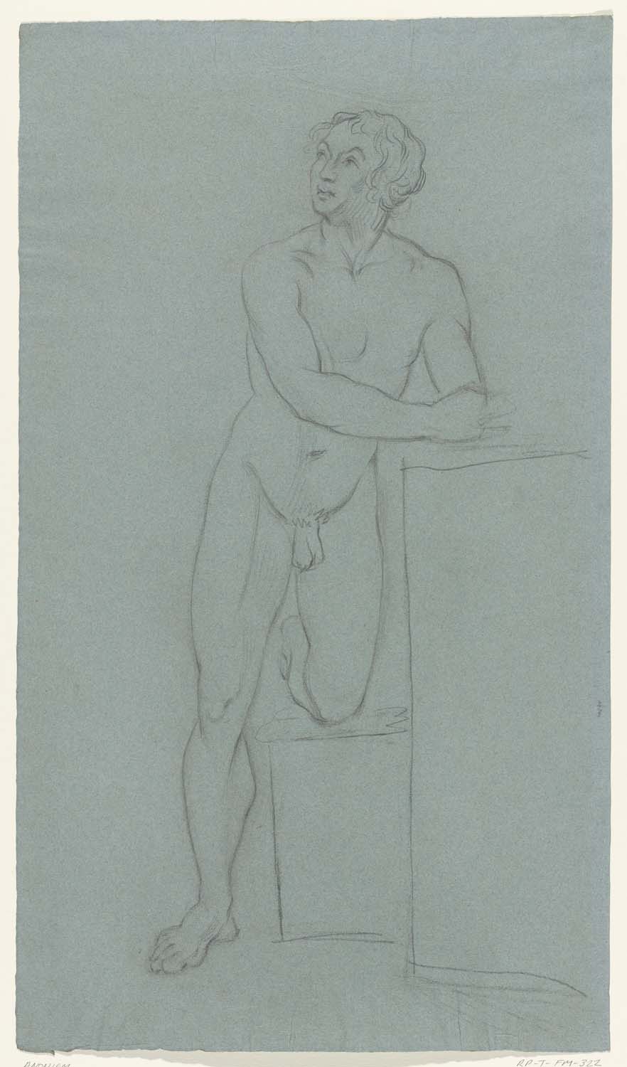 Staand mannelijk naakt met opgeheven arm, naar rechts