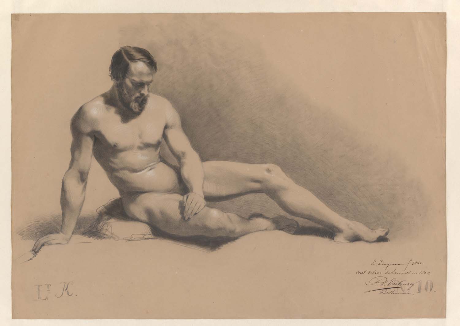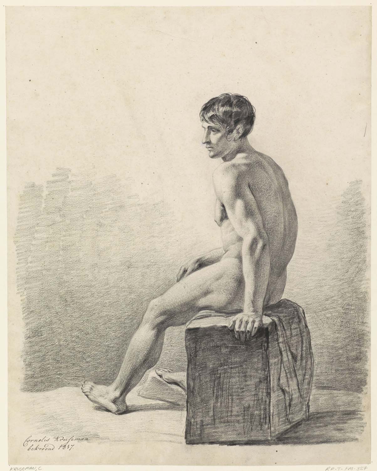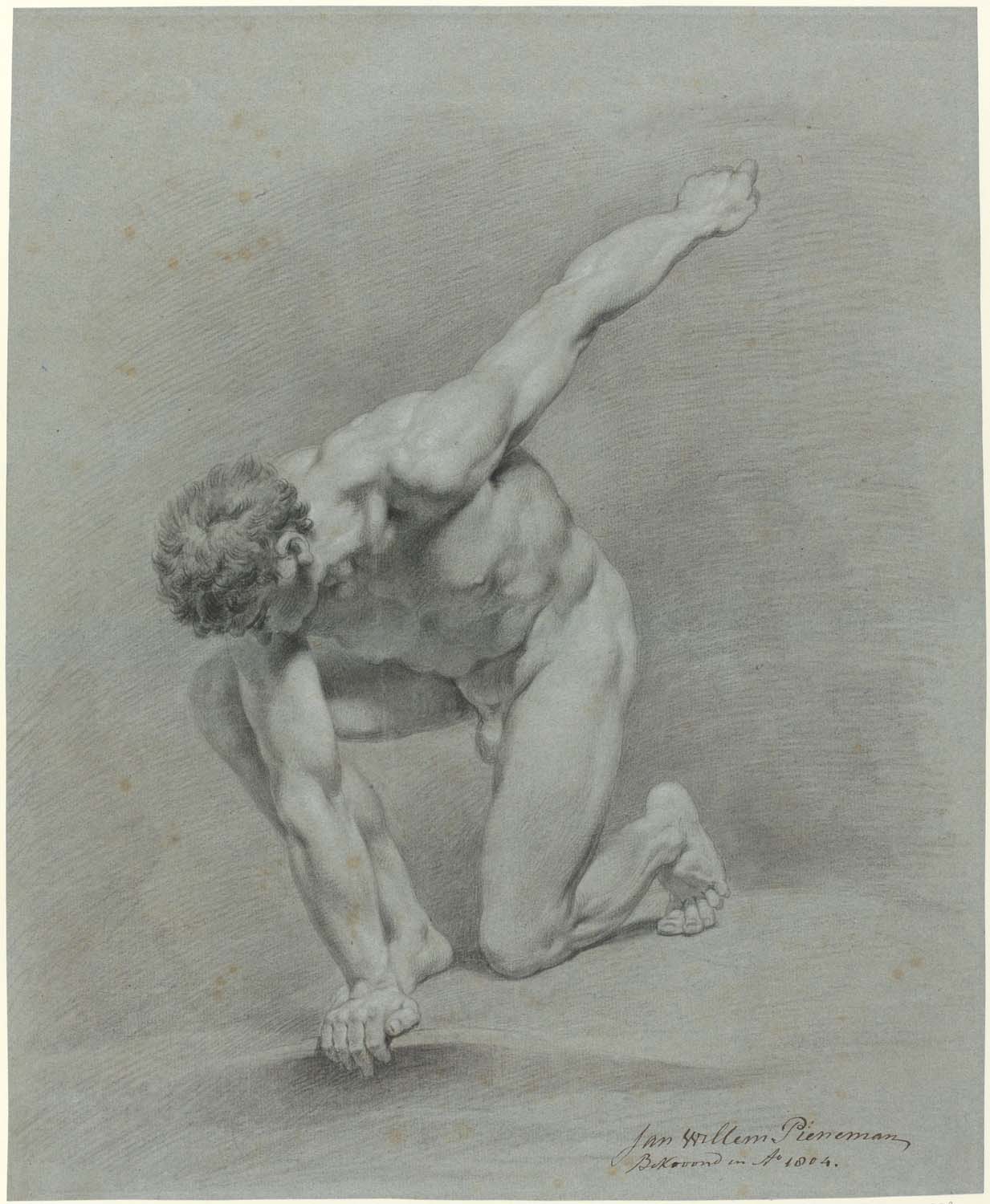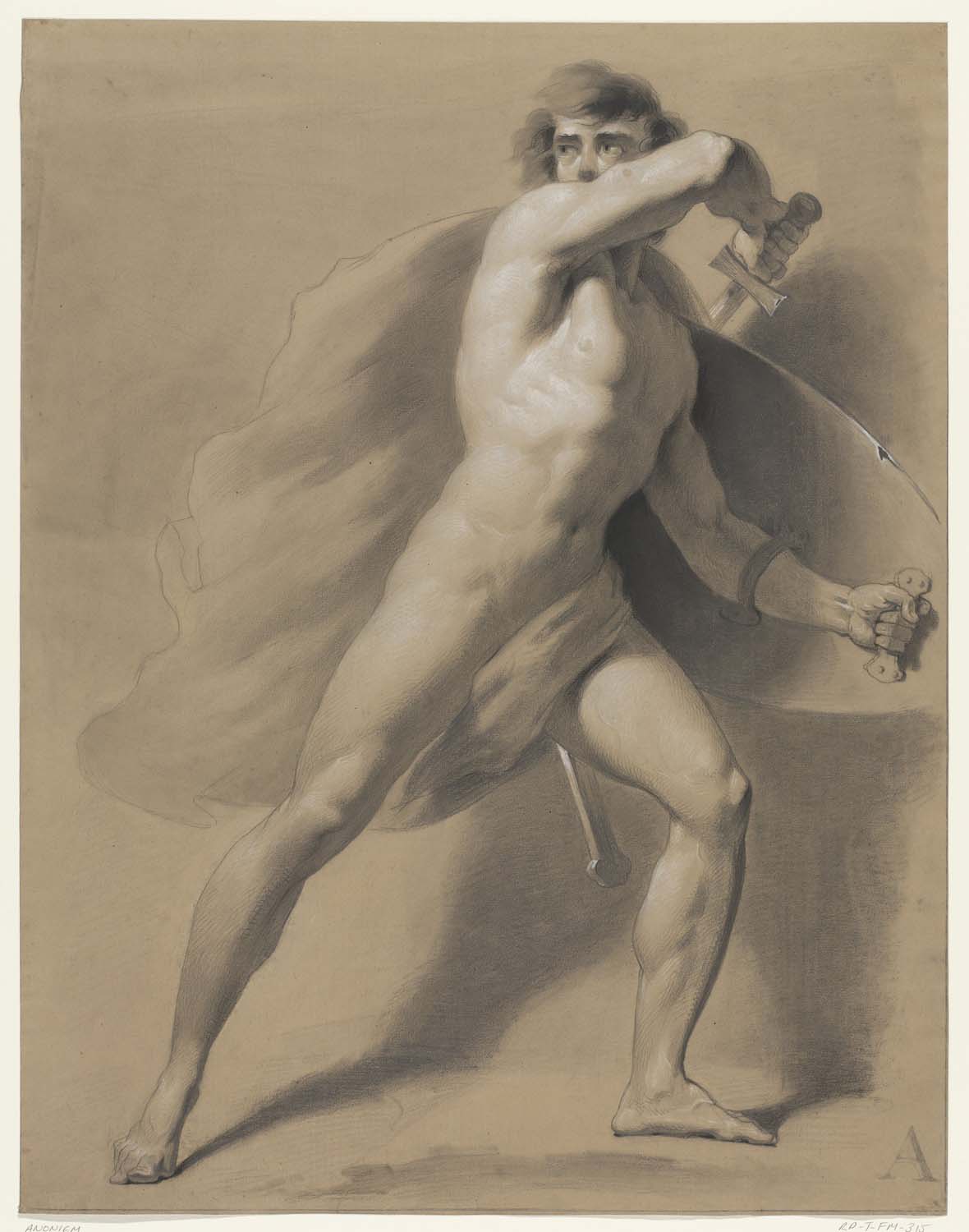 Staand mannelijk naakt met opgeheven arm, naar rechts