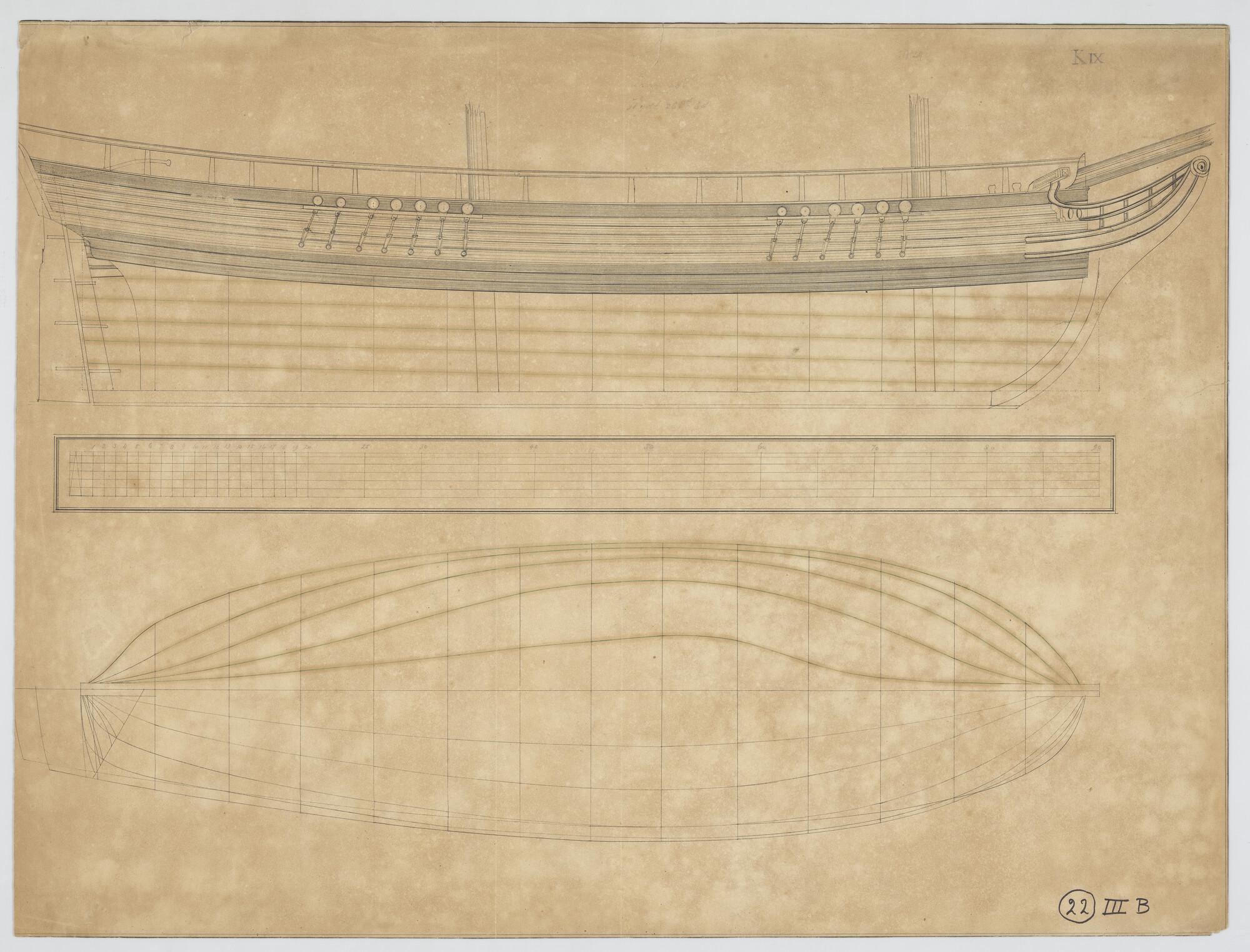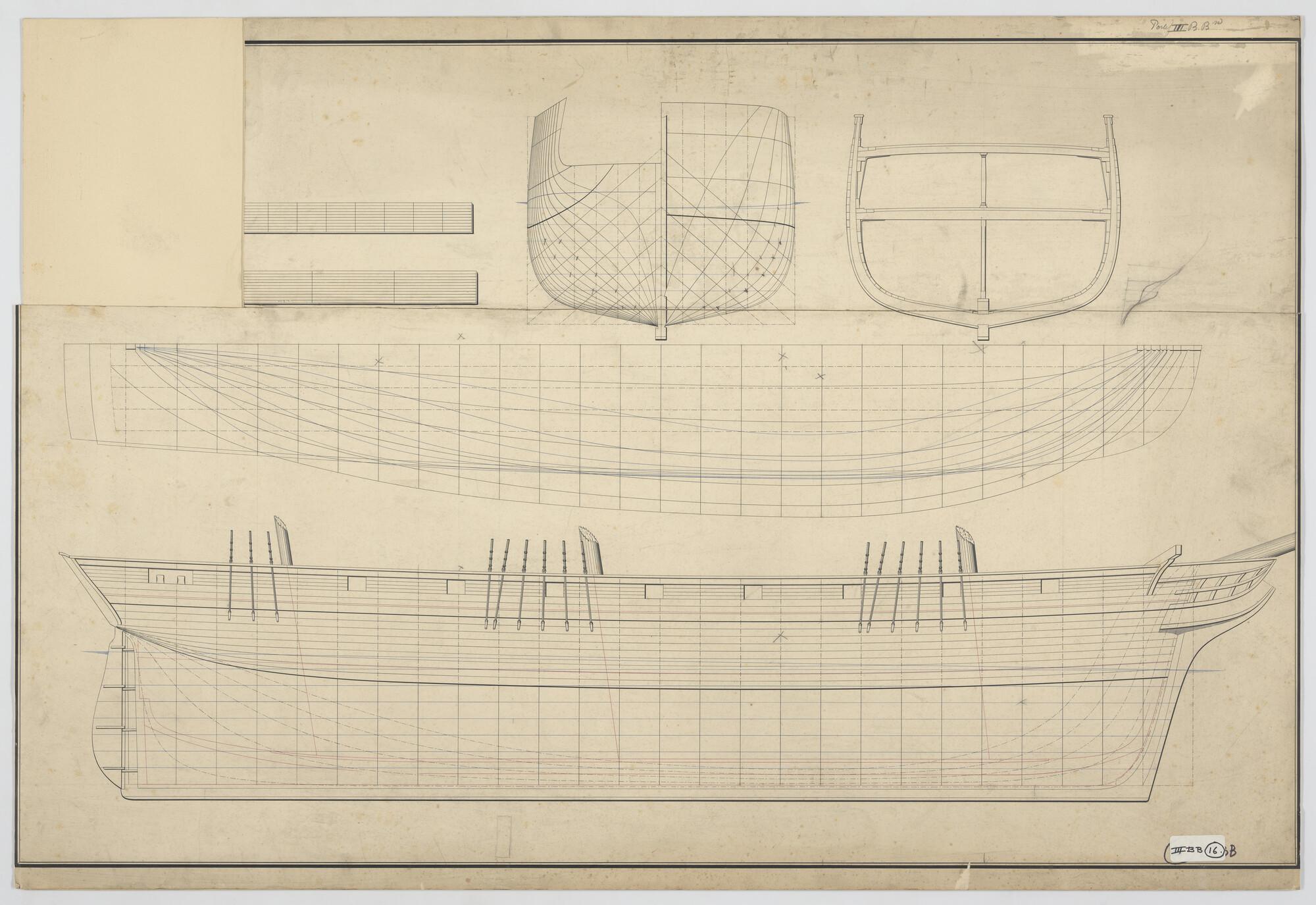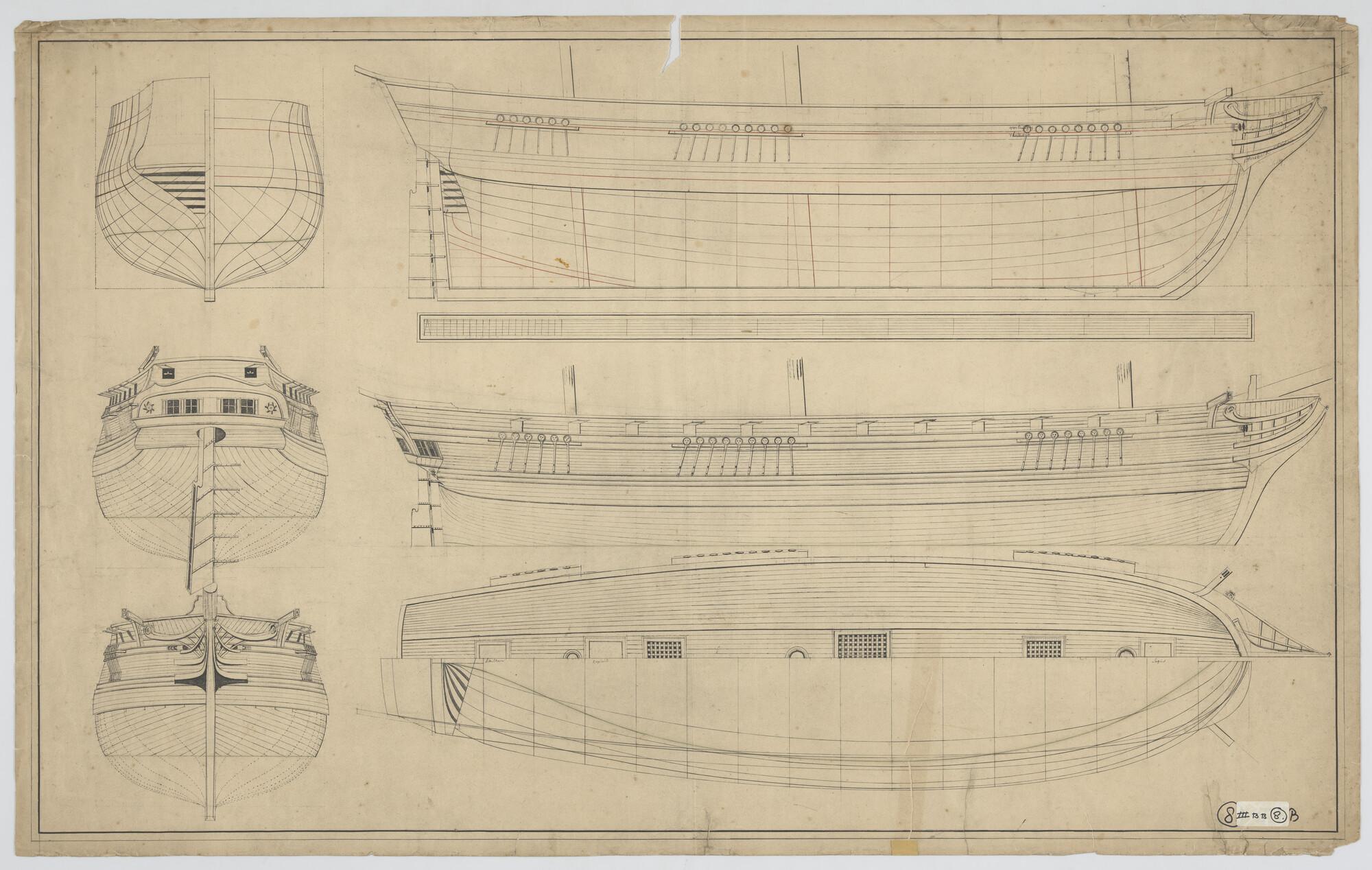 Lijnenplan en roer van een fregat van 38 stukken