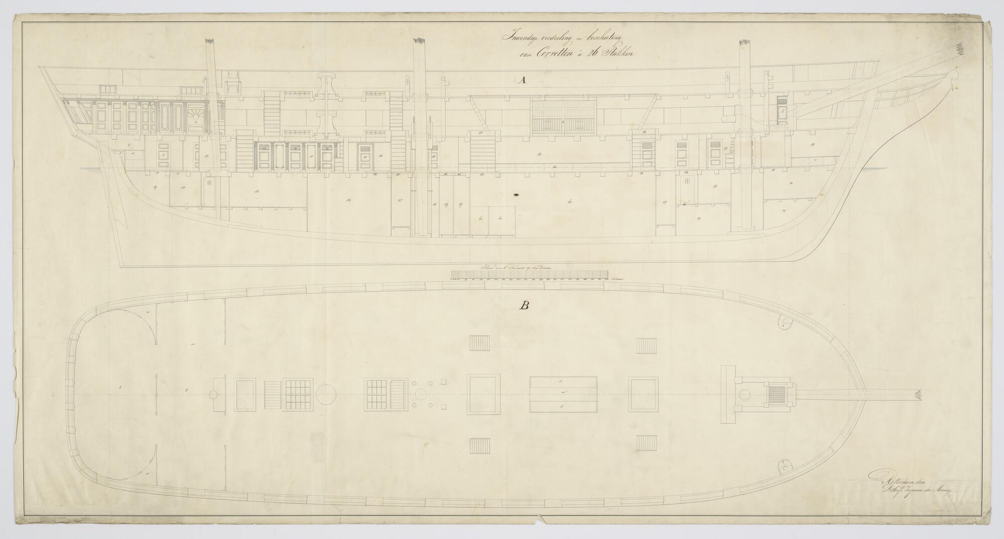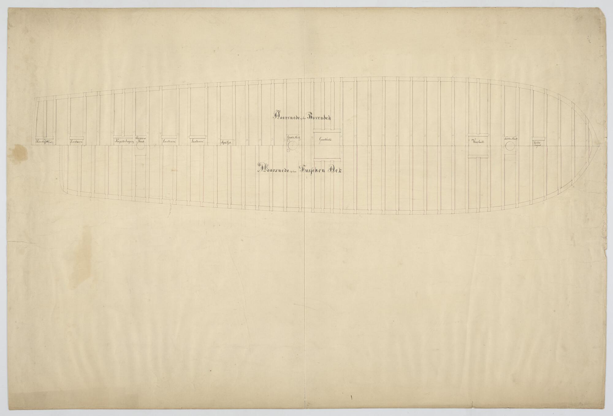 Langsdoorsnede en bovendek van een korvet