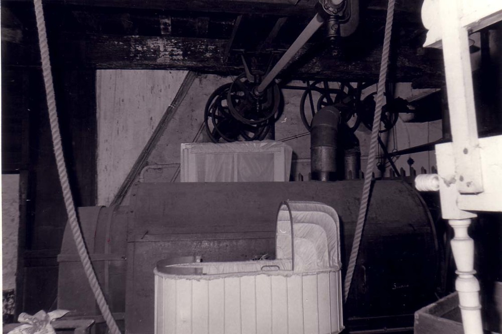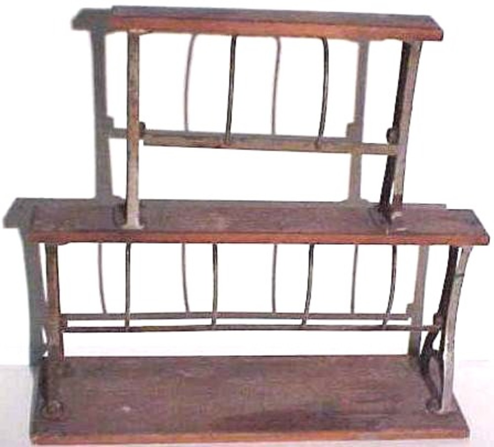 papierrol. Apparaat van hout en ijzer waarin twee pa...