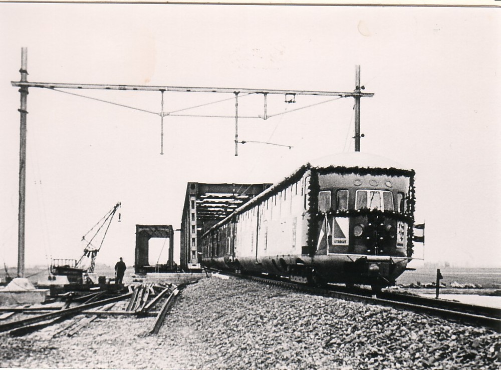 Versierde trein rijd over de herstelde brug bij Hedel.