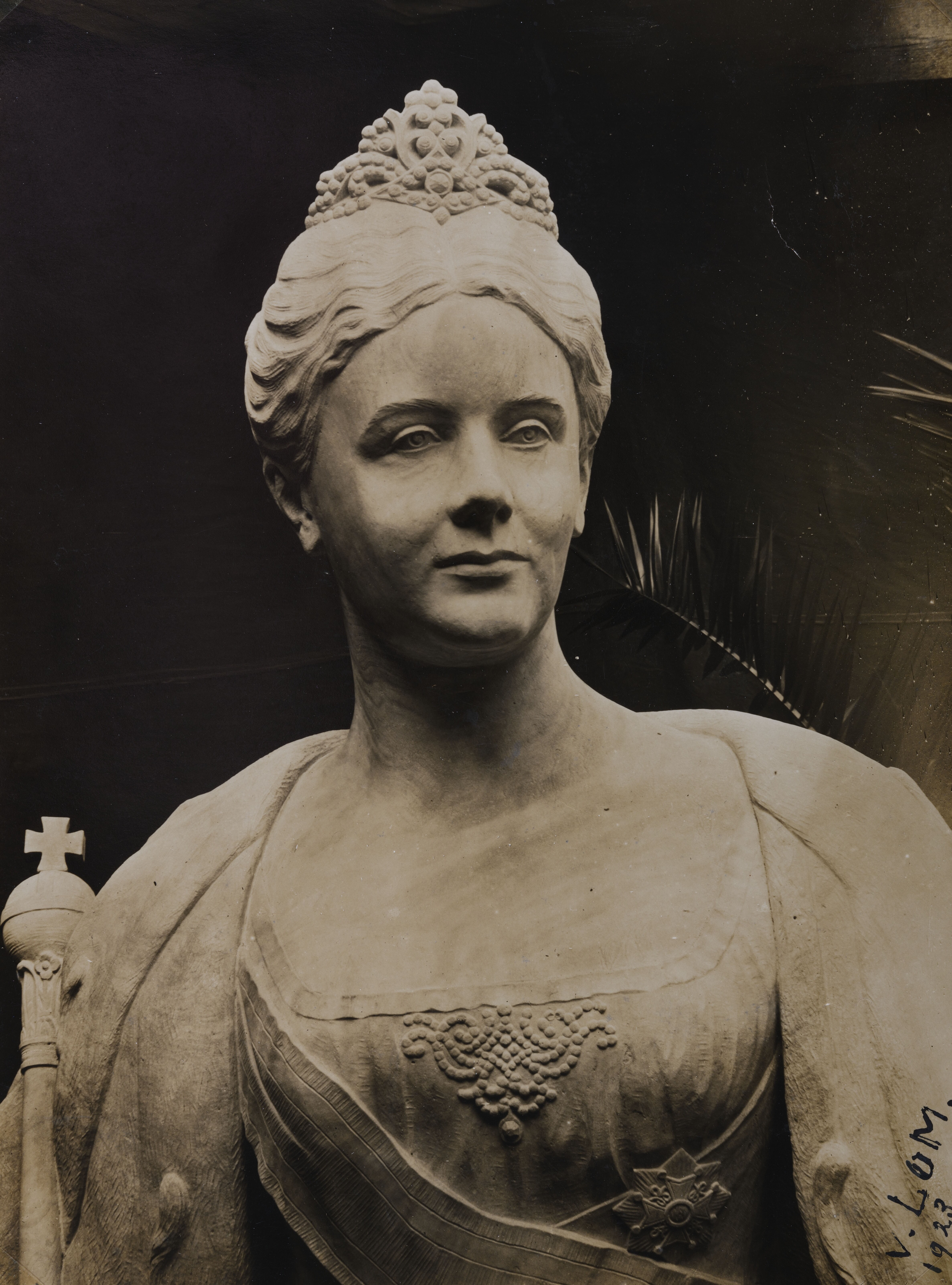 Detailopname van het standbeeld van Koningin Wilhelm...