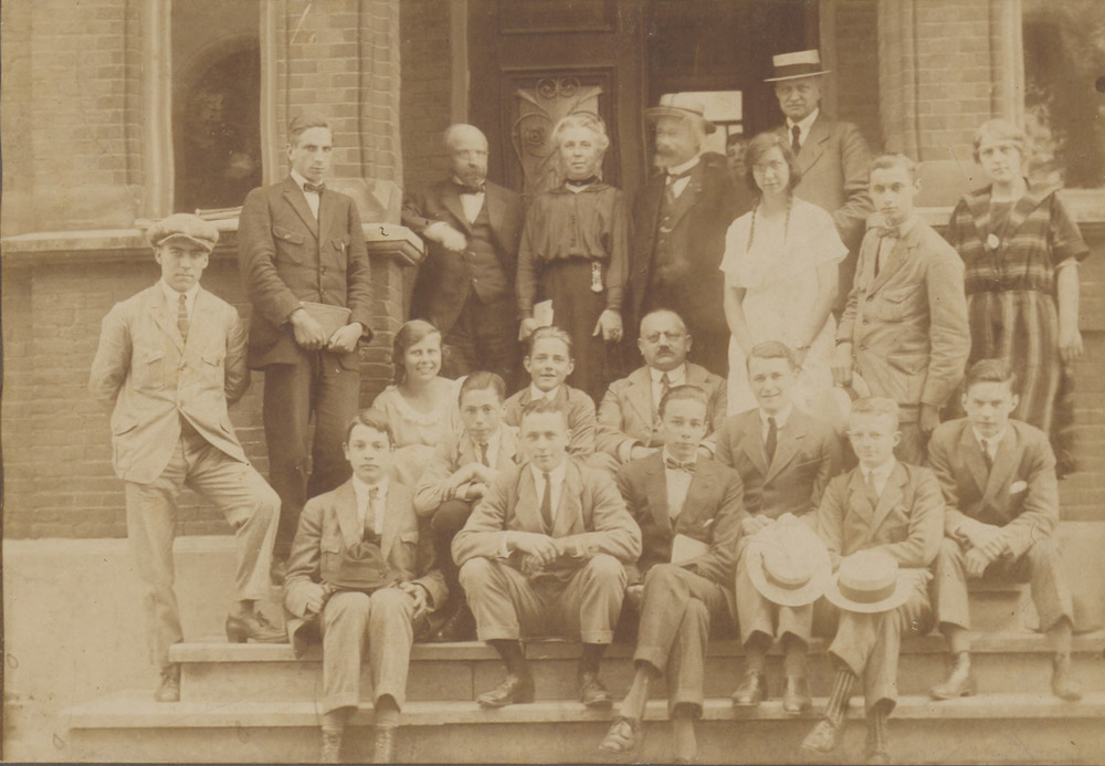 Een groepsfoto gemaakt voor de hoofdingang aan de Re...