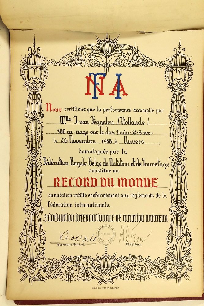 Zeven zwem wereldrecord certificaten 1938 van zwemst...