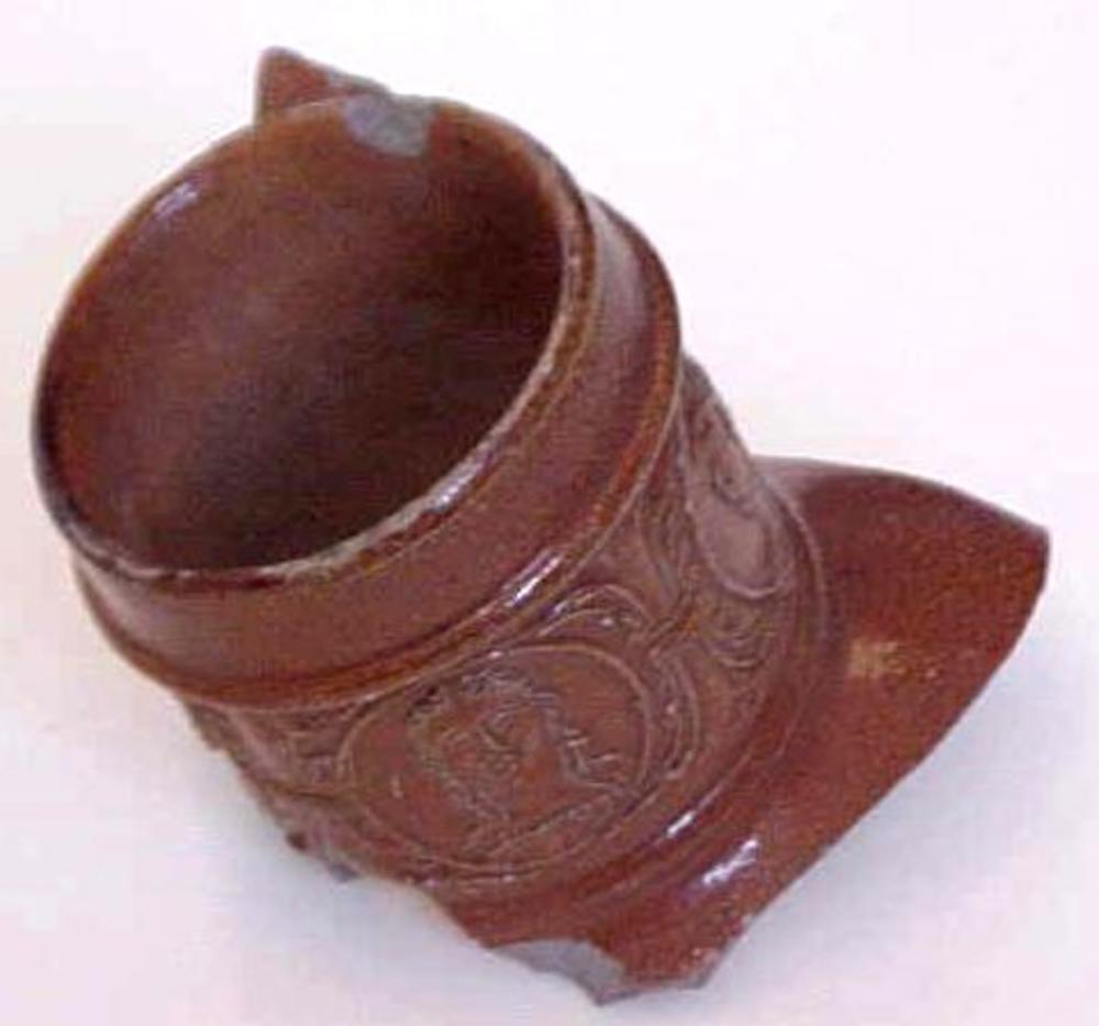 kruikfragment van steengoed versierd in reliëf van d...