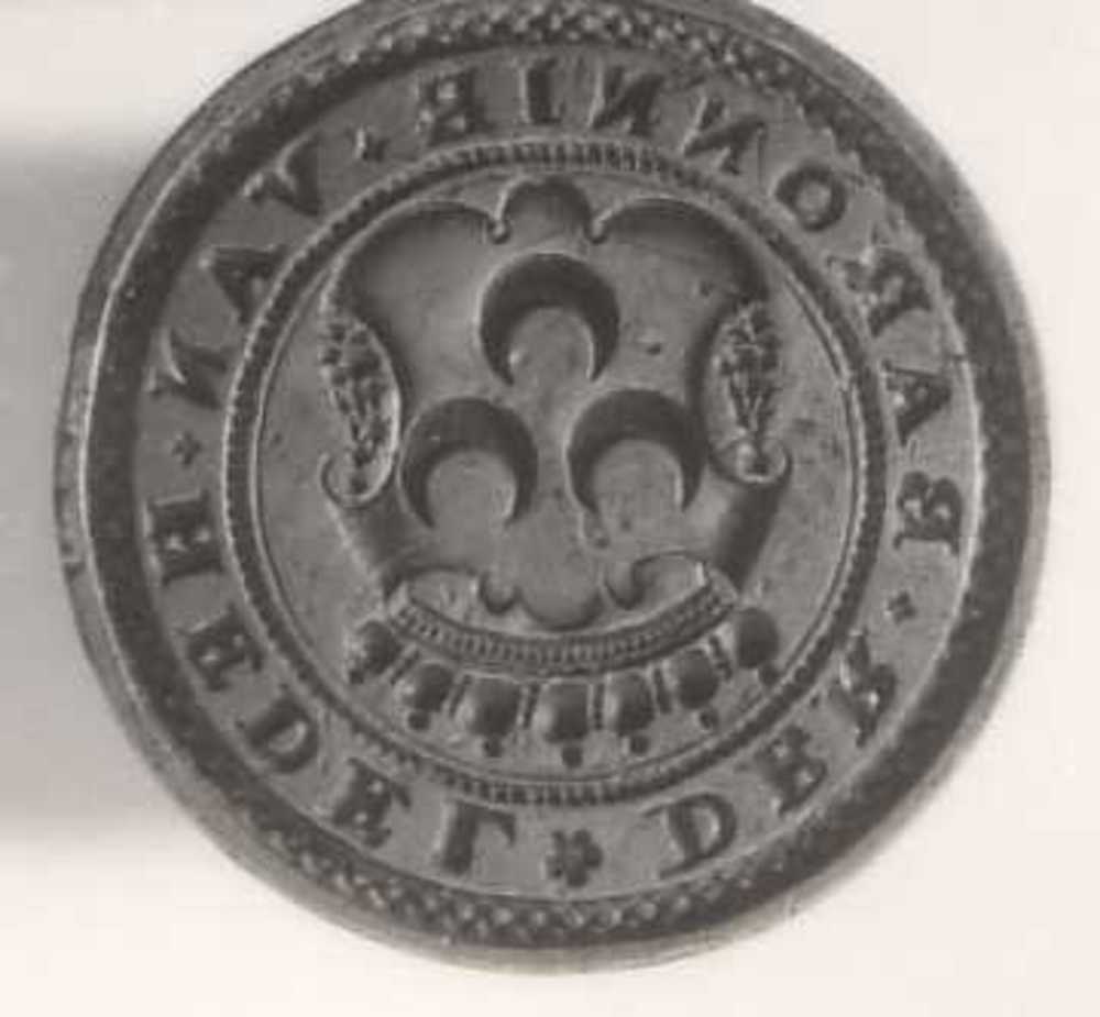 stempel Baronie van Hedel. Rond gedraaid houten hand...