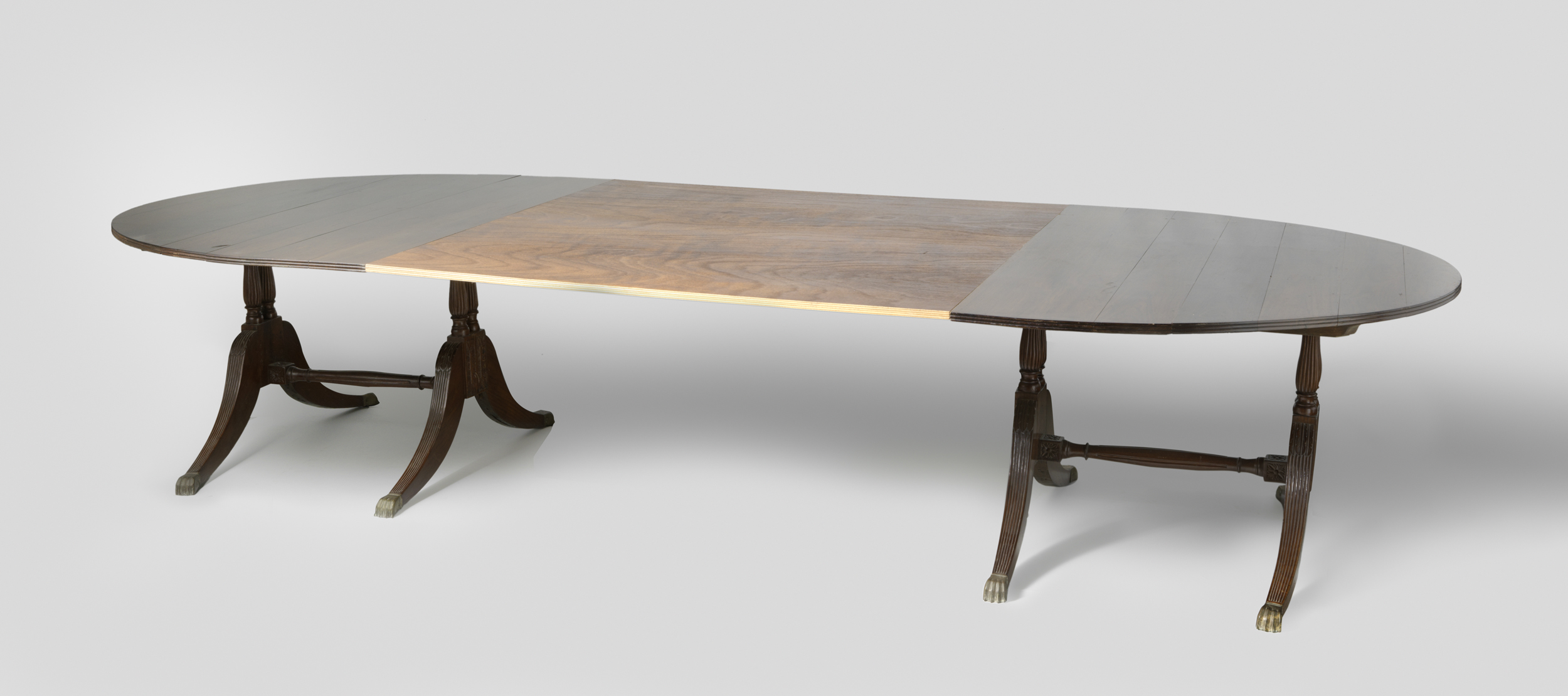 Tafel met ovaal blad en schraagvormige poten die ein...