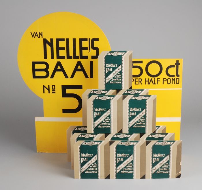 Geel reclamebord VAN NELLE´S BAAI No. 5 met gestapel...
