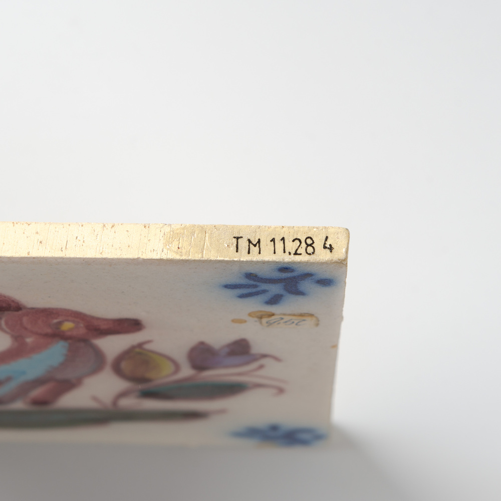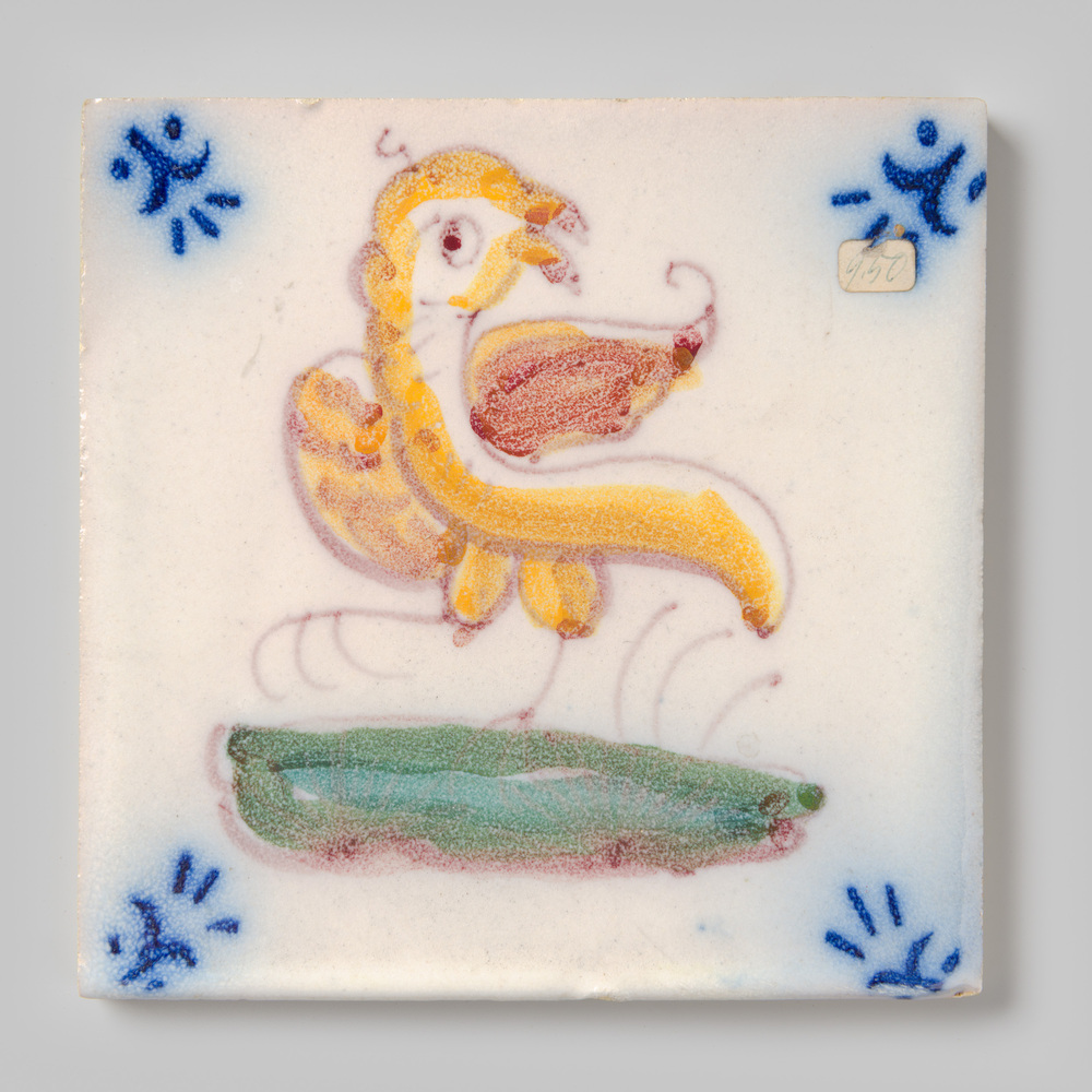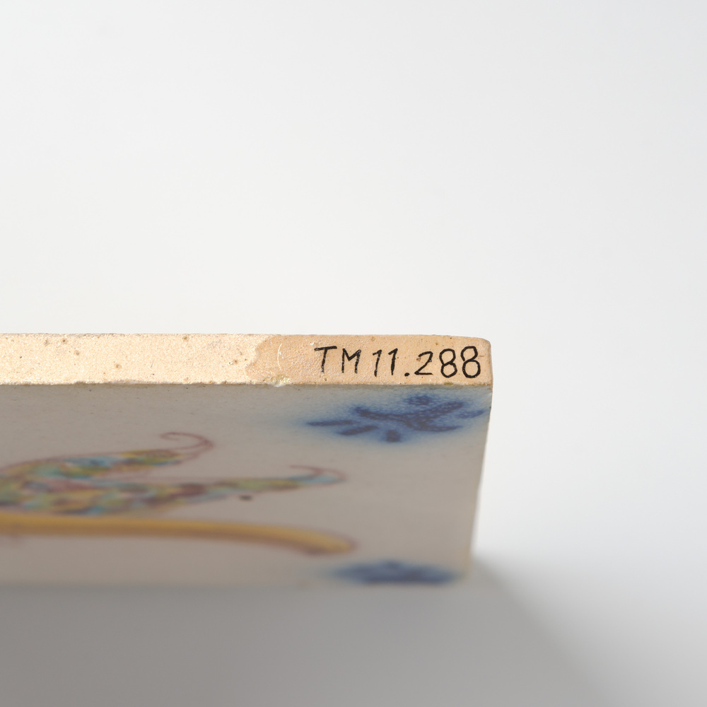 Tegel van keramiek met tinglazuur, voorstellende: vo...